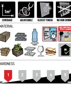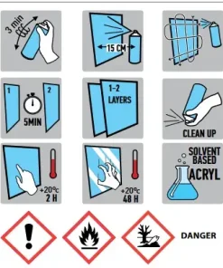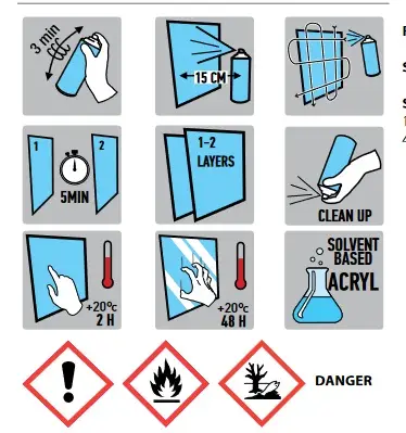 Instructions: Clean the surface of oils, grease, dirt, wax and loose rust. Shake the spray can well before use. Spray a small test patch on an invisible area. Spray several thin layers from a distance of 15 cm. Two paint layers are needed for adequate film thickness. Let the surface dry about 5 min. between each layer. Clean the nozzle by spraying the can upside down until only propellant comes out. Wipe off any excess paint from nozzle if necessary.