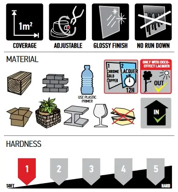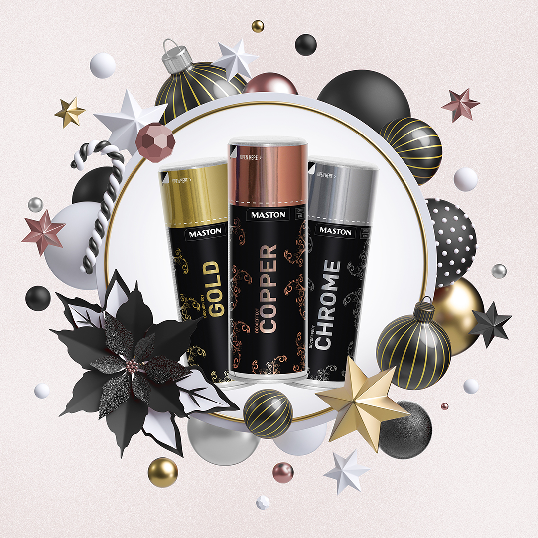 Maston Decoffect spray is a high-gloss decorative acryl paint for indoor use. Leaves shiny decorative surface, dries fast, and covers well. For metal, wood, glass and most artificial surfaces. Limited wear and weather resistance. We recommend Clear Coat Effect spray on dry surface for better resistance. Coverage around 1-2 m². Drying time (at 20°C, 50% relative air humidity): Dust-dry: after approx. 30 minutes, Dry to touch: after approx. 2 hours, Completely dry: after 48 hours