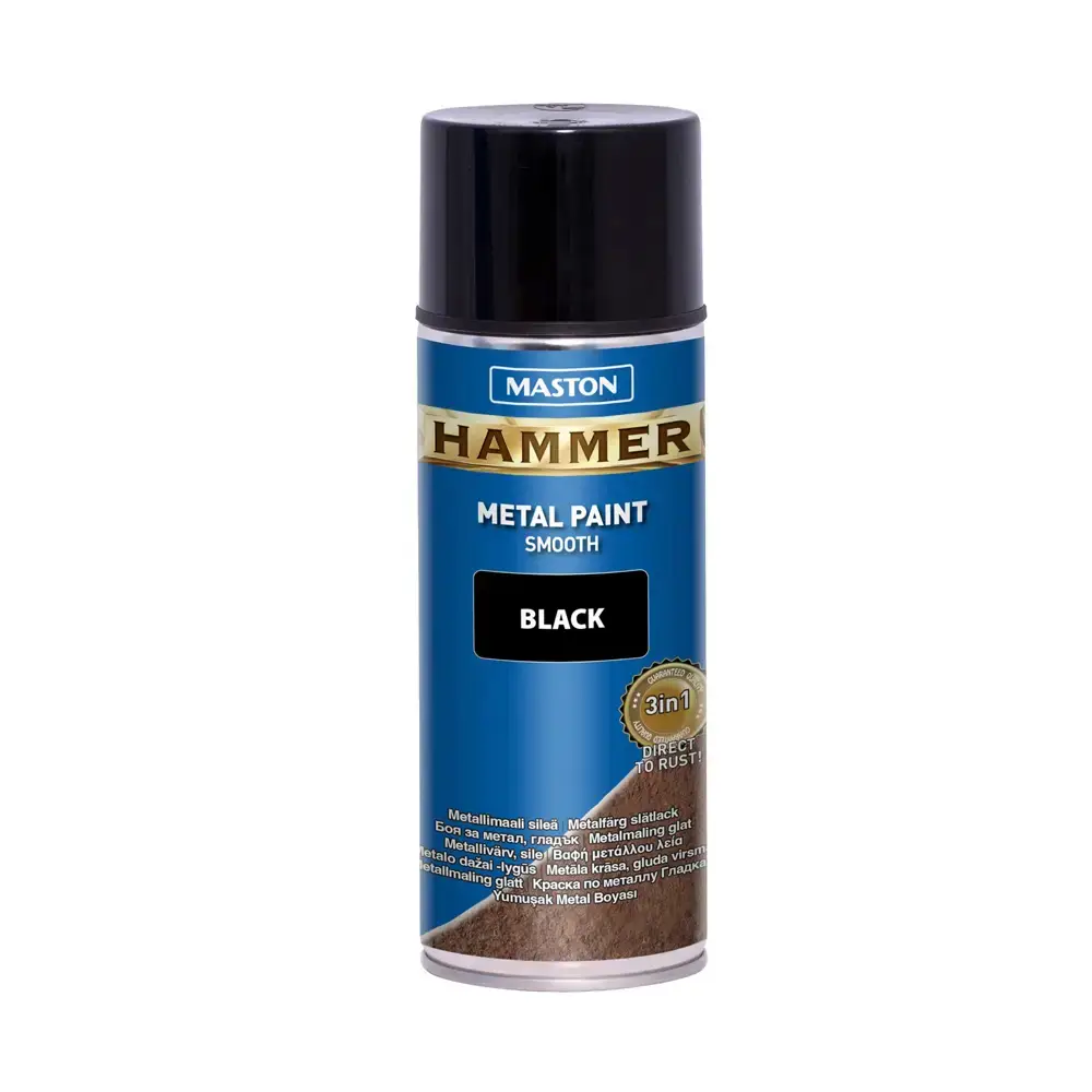 Maston Hammer Smooth surfaced metallic spray paint for all types of wood and metal surfaces, indoors and outdoors. A glossy smooth surface. Suitable for on new and on old surface. For example, rusty or painted iron and steel. For aluminum, stainless steel, brass and copper surfaces we recommend priming with Maston 1K acid primer.