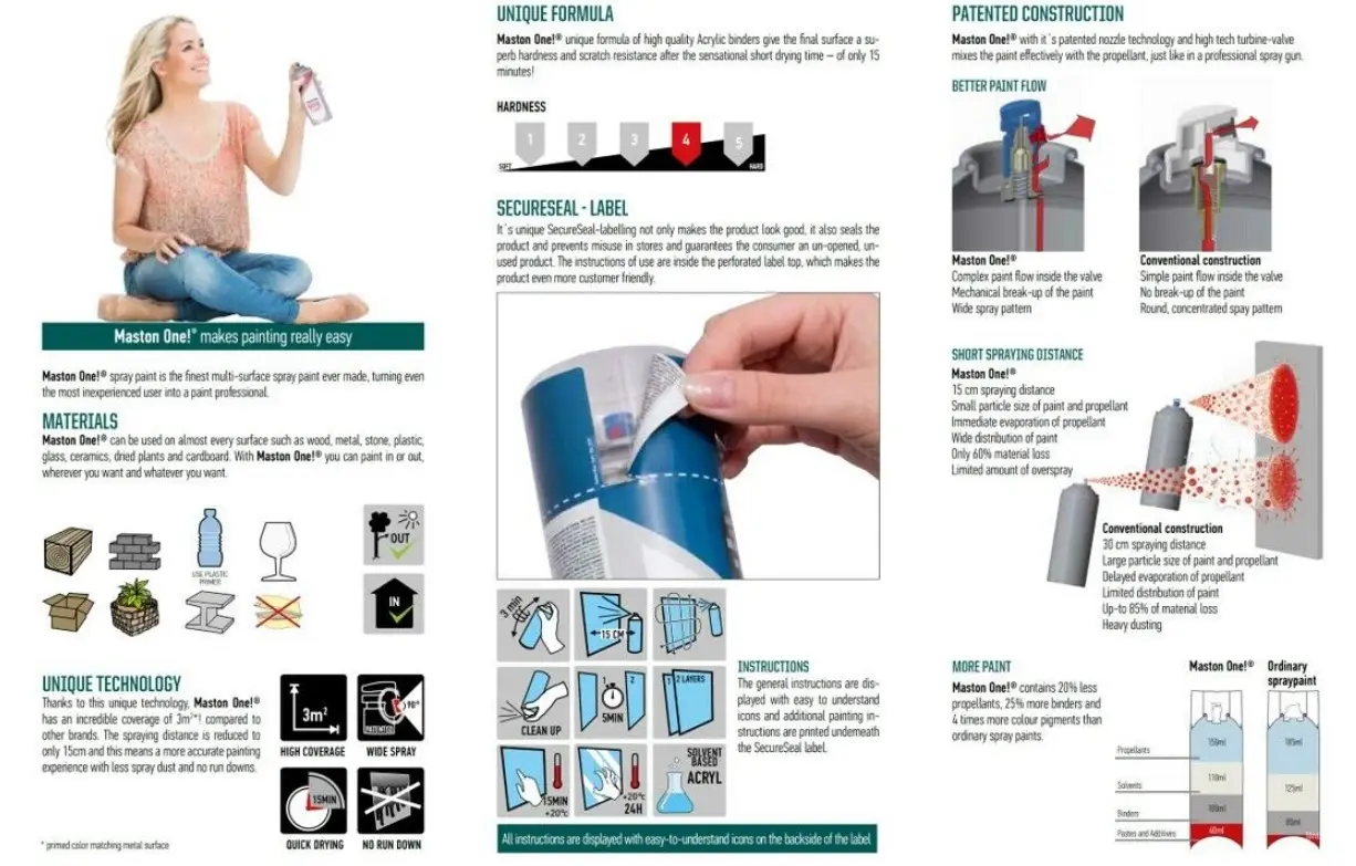 Maston One® with its unique technology the spraying distance is reduced to only 15cm, this means a more accurate painting experience with less spray dust and no run downs. The nozzle can be adjusted to any position from horizontal to vertical, making the product even more customer-friendly, not to mention sensationally fast drying time – just 15 minutes to touch dry!