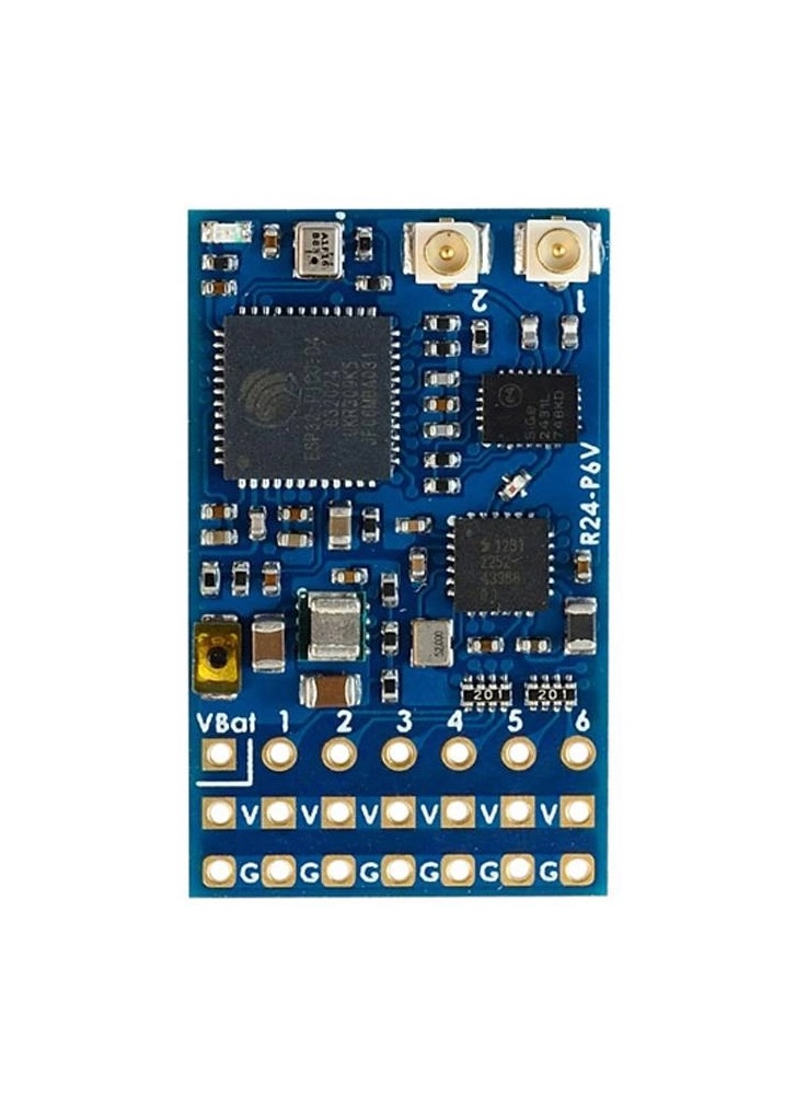 Equipped with an ESP32 processor and SX1281 RF chip, the R24-P6V operates on the 2.4GHz frequency band and features 6 PWM outputs for connecting servos or other peripherals. The receiver supports 2-6S LiPo battery voltage sensing, allowing you to monitor your aircraft’s power status in real-time.