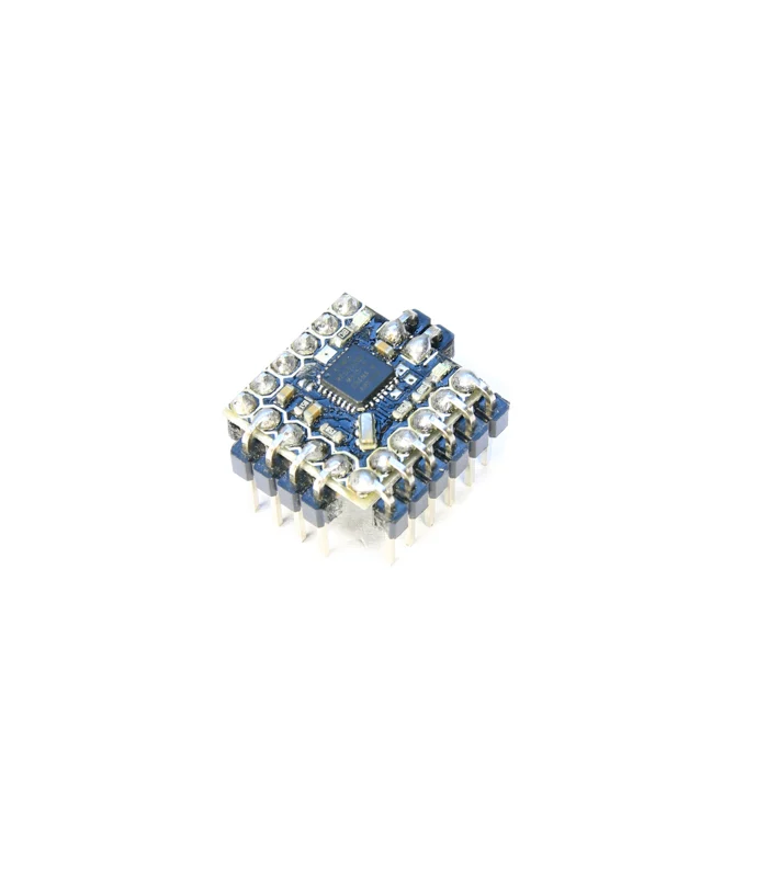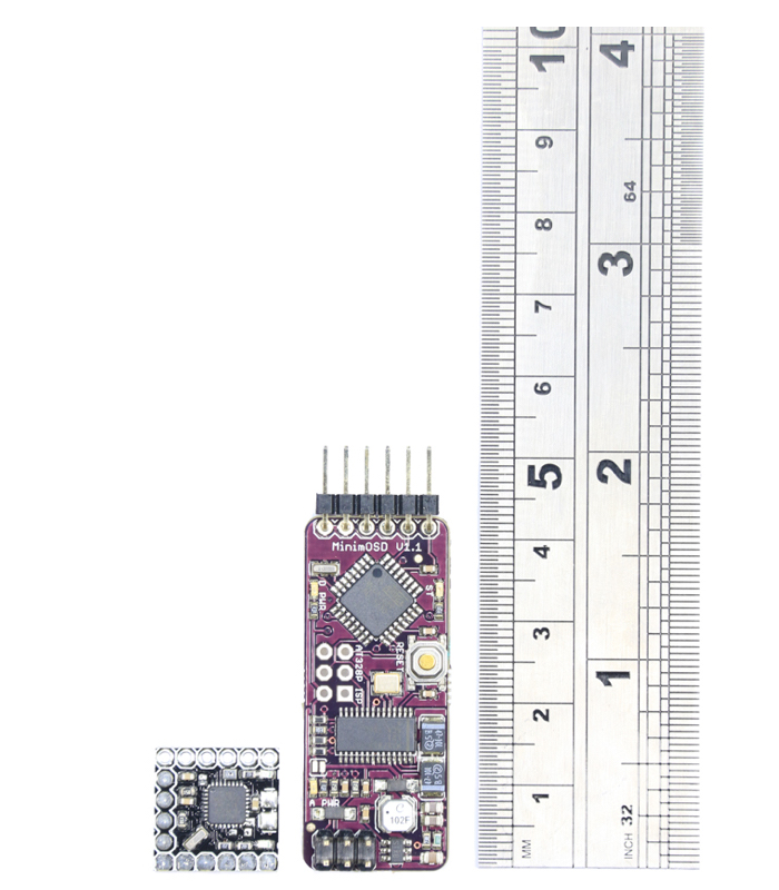 The Micro MinimOSD has been designed with racing drones in mind, it weighs less than 1g and is absolutely tiny. Measuring 15mm x 15mm, it’s about a 1/3 of the size of the older MinimOSD and yet packs all of its features bar the Dc/Dc converter. The OSD coupled with the MWOSD firmware boasts a lot of features. If you have the appropriate sensors, it lets you display all of the usual telemetry data like height, speed and position with a virtual horizon, but it also allows you to display a callsign and even tune PID settings via the OSD menu (available on MultiWii firmwares like Cleanflight). It has two voltage inputs, so it can be used to monitor both a flight battery and an auxiliary battery. Lastly there is a pin for analog/digital PWM RSSI and a connection where you can attach a current sensor. The OSD can be flashed with firmware that is MAVLink compatible for ArduCopter, or MultiWii Serial compatible for MultiWii and Baseflight / Cleanflight control boards.