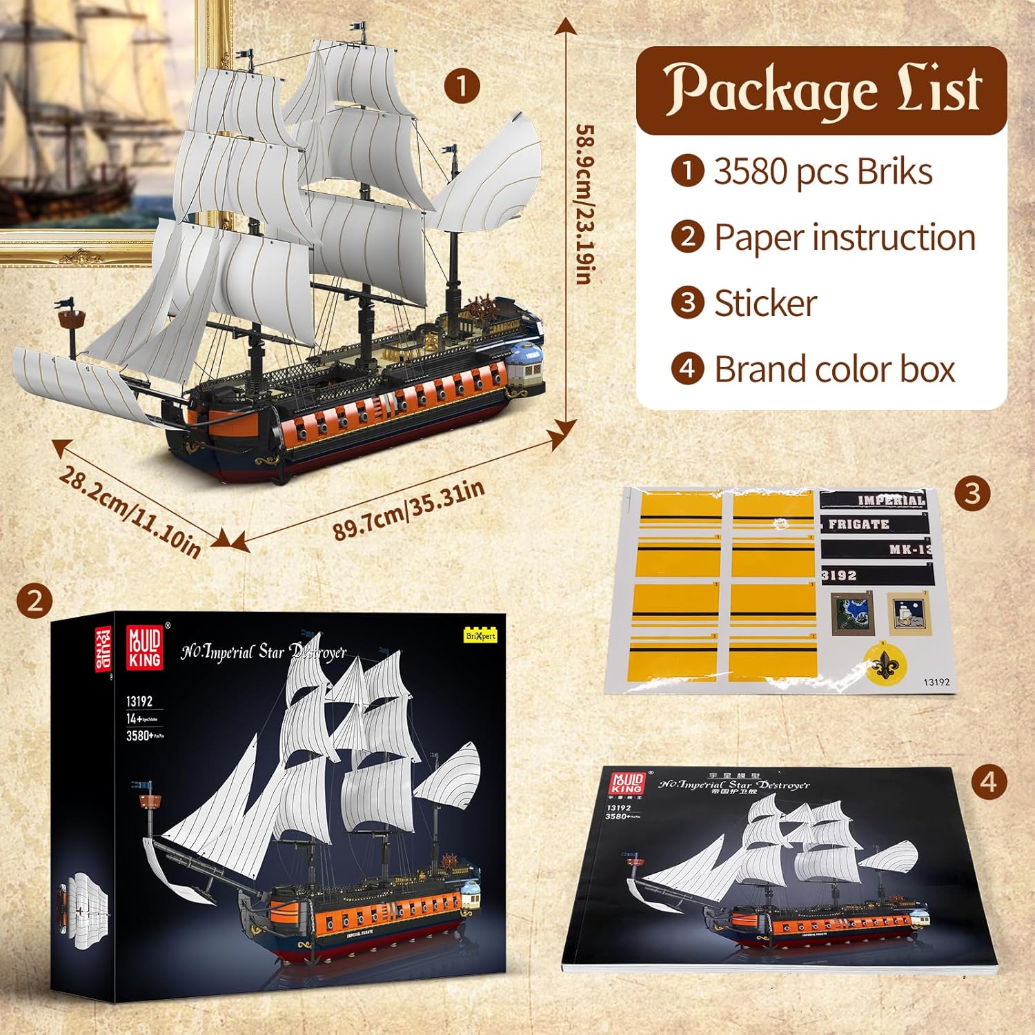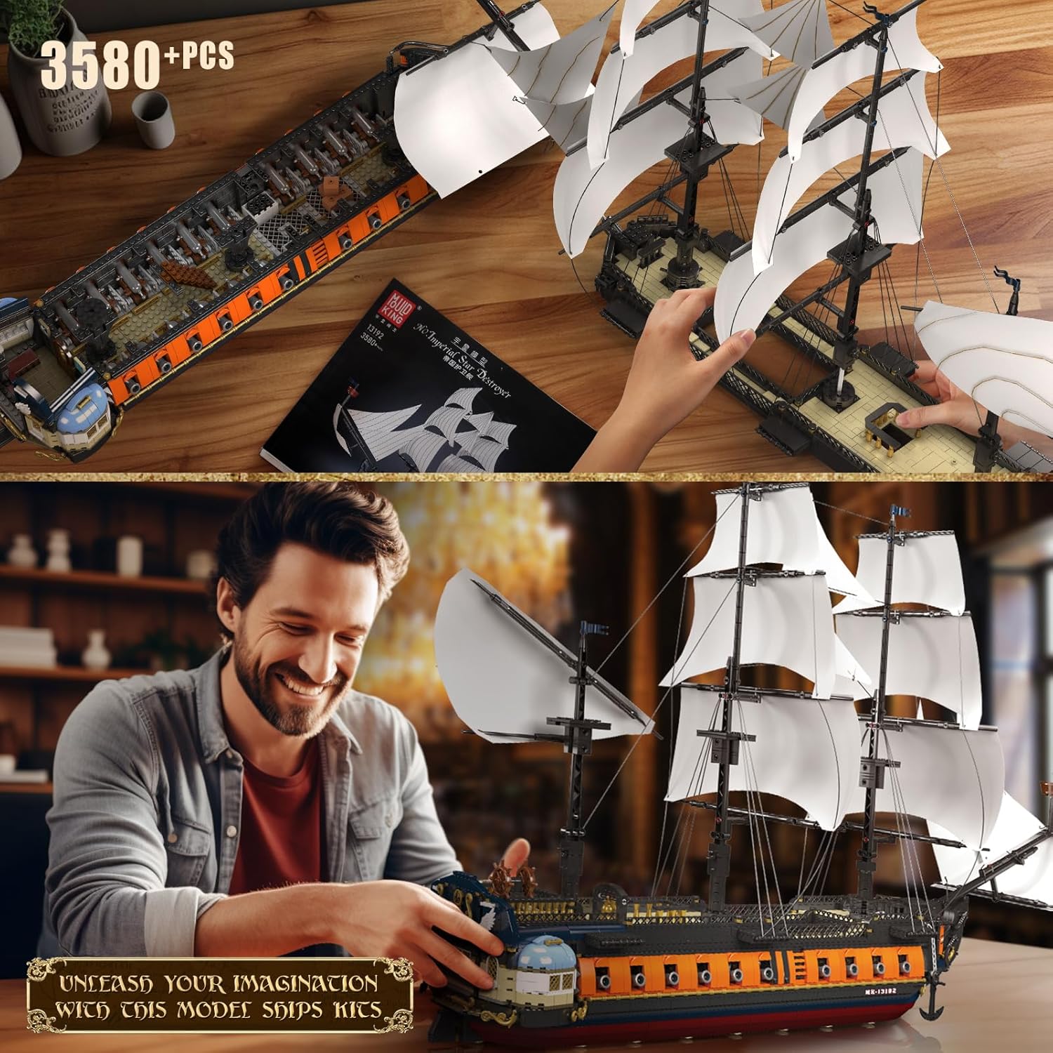 - 【Mould King 13192】Pirate ship is assembled from 3580 building block parts and comes with colorful paper instructions to make it easier for you to assemble.