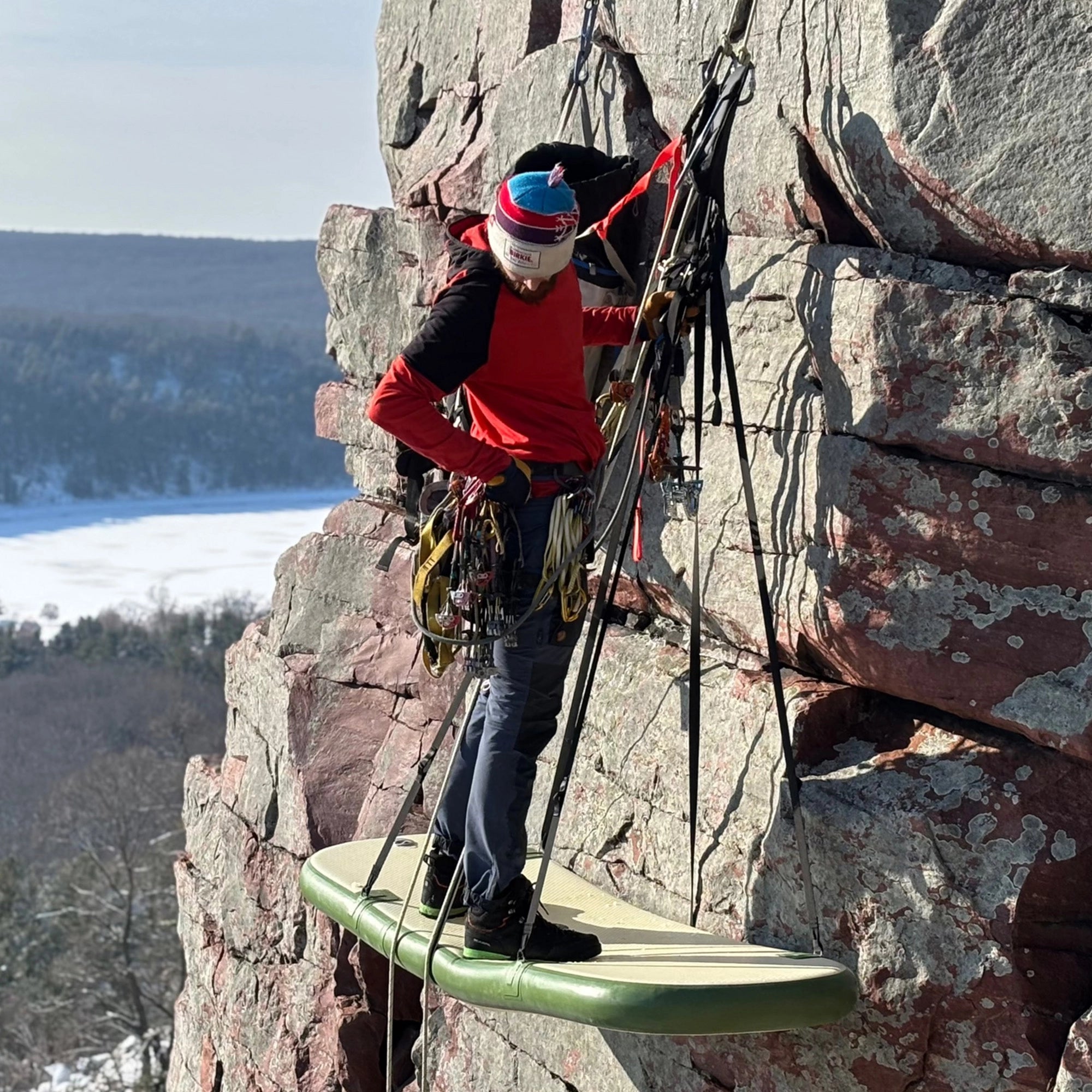The Multiledge is a high-pressure inflatable portaledge designed to be the best possible balance between lightness, rigidity, and durability. The Multiledge may be used as a standard sleeping portaledge, portable belay ledge, car camping mattress, or a deluxe backpacking sleeping pad. The Multiledge provides a more rigid platform than a traditional aluminum-frame fabric-spanned portaledge when pumped to the intended operating pressure (6-12 psi). The Mutliledge is lighter and more insulated than framed portaledges, and allows you to forgo your old sleeping pad (saving even more weight). When used for sleeping on the ground or on the wall, the pressure can be slowly released until the user finds their optimal comfort level.