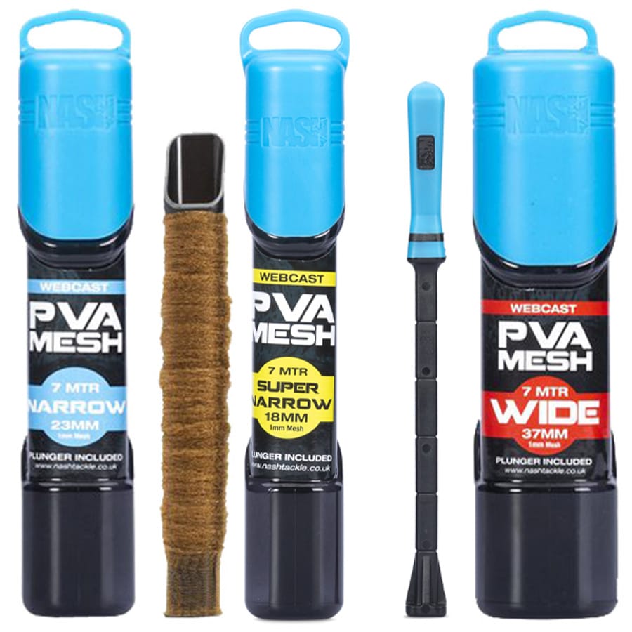 Three diameters of loading tubes satisfy any feeding requirement from tiny sticks when scratching for bites to large mesh bags when carp are feeding hard. Super Narrow – 18mm, Narrow – 23mm and Wide – 37mm. For the Nash Webcast PVA Refill – 5m see product code 24015.