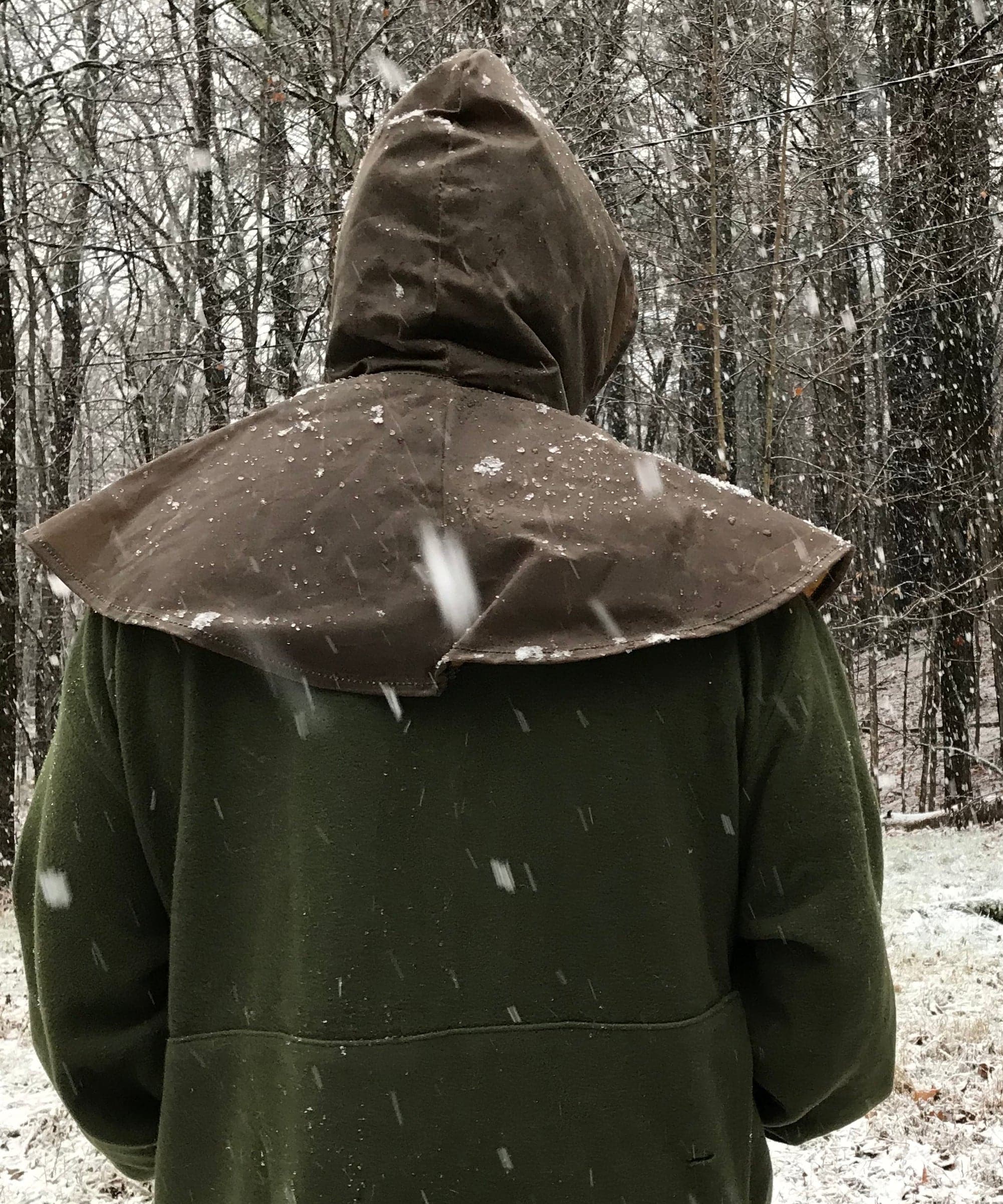 For years customers have raved about our oilskin watch coat. The 18th Century design of waxed cloth over layer does a great job of keeping out the rain in rough terrain. The number one thing we hear about that watch coat is that modern folks expect a hood. To fill that need while maintaining historical integrity we’ve developed a separate hood with a mantle. Made out of our same waterproof oilskin, it is nice and thin but completely impervious to water. The hood can be worn over our watch coat for full upper body protection. If is a little misty, then just wear the hood to keep your head and shoulders dry.