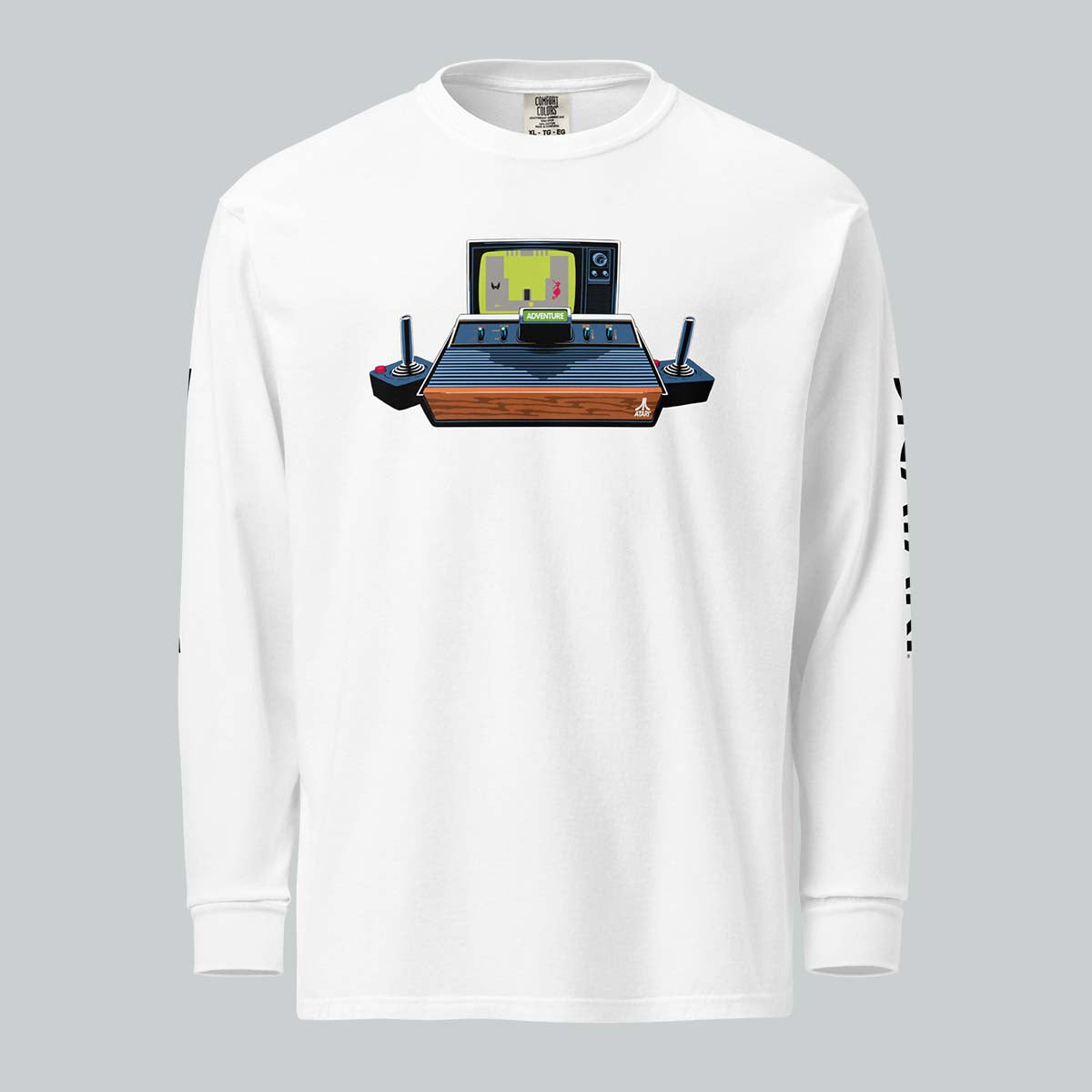 Adventure like it was … on a CRT connected to 2600 console, joysticks at the ready. Now on a long-sleeved tee with printing on both arms