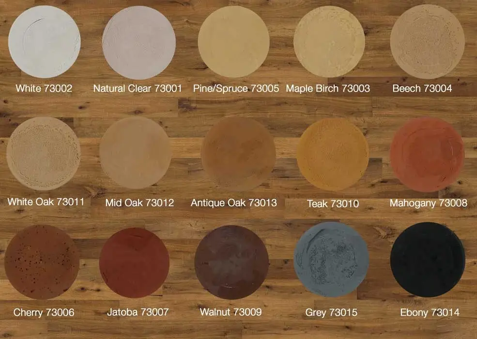 The circular colour samples shown are wet. It Dries a lighter colour and the colour returns with a protective clear Osmo finish.