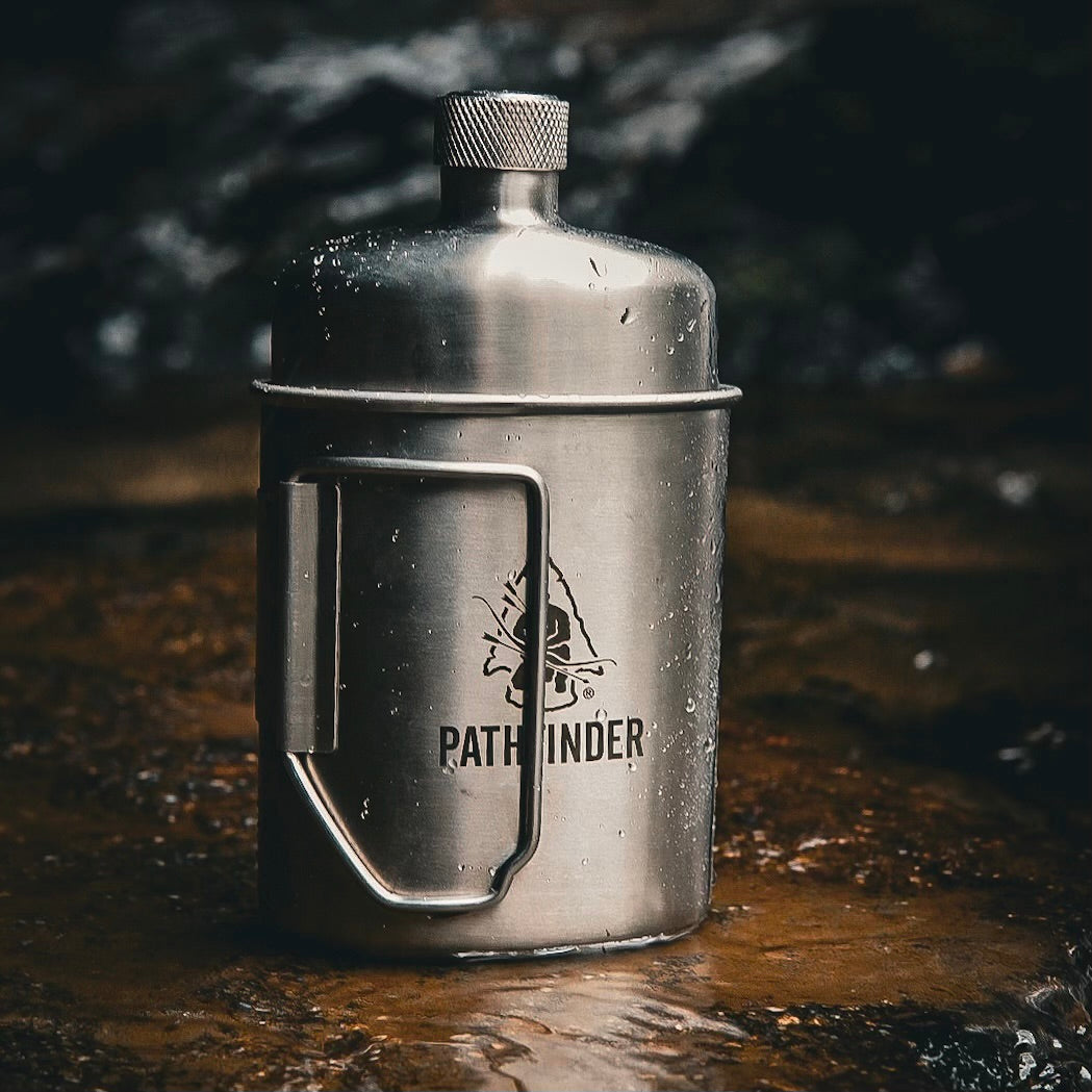 Capture memories with the timeless Pathfinder M34 Scout Canteen! Perfect for a weekend hike or an evening around the campfire, this set includes a heft 18oz stainless steel flask style canteen and a 16oz nesting cup set, weighing in at 14.4oz.