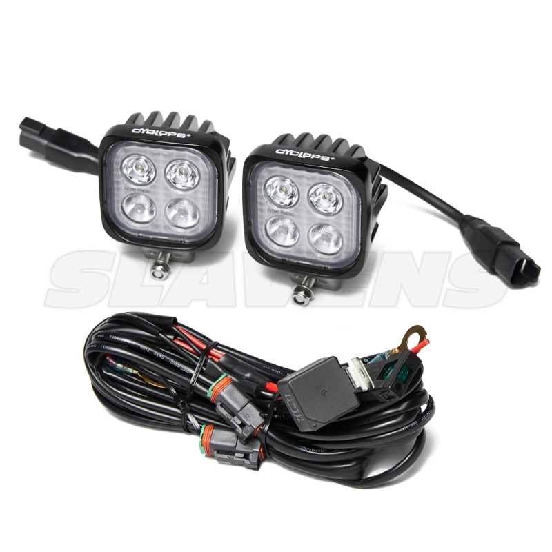 The new Cyclops Pegasus led light set comes complete with a high-quality relayed wire harness and a potent combo light beam pattern. These lights feature Cree 5-watt emitters with two 10 degree and two 25-degree optics. Good for 300ft of lighting (white). This combo beam pattern offers good forward lighting and is extremely conspicuous. The light set is white 5600K, perfect to allow those autos to see you. Lightweight and robust at 2.75 inches with a single stud mounting, they fit just about anywhere you would like to mount your lights. Check out Slavens Racing full catalog of lightning options for your bike!