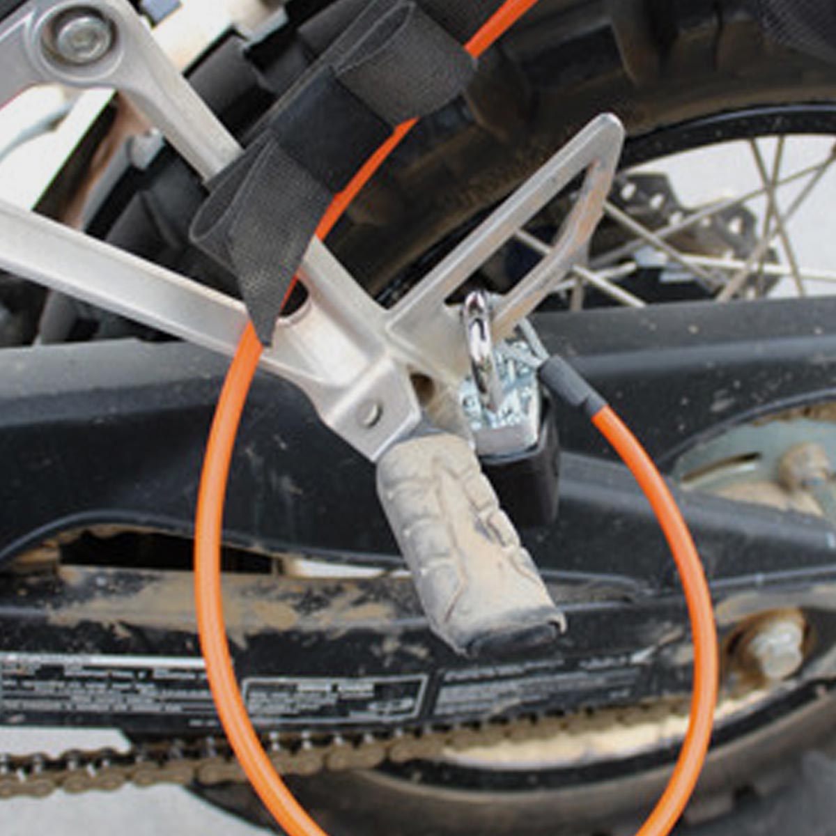 Feeling paranoid? The Giant Loop QuickLoop Security Cables and a padlock (not included) provide peace of mind with a highly visible orange that says, “I’m locked, look for an easier target.” Use the 36″ to lock helmet and jacket to bike. Giant Loop’s Great Basin Saddlebag and Siskiyou Panniers feature cable pass-throughs, so riders can secure their luggage to a parked motorcycle with the 84″ QuickLoop Cable.