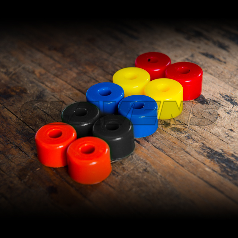 Rebound Elastomers: Absorb the abuse on both directions. Rebound elastomers further absorb high frequency abuse and vibration. They are half the height of our Compression Elastomers, with a different chemical make up to control the articulation of the Flexx Handlebars during the upward movement.