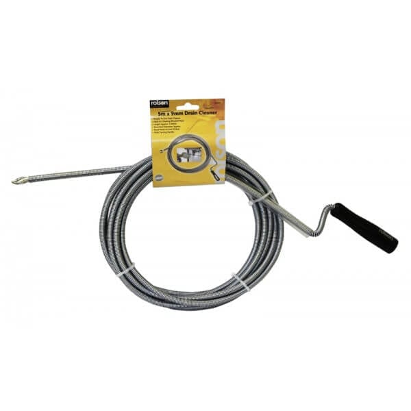 5mtr x 9mm Drain Cleaner For cleaning blocked waste pipes. Length 5mtr x 9mm diameter with corkscrew end