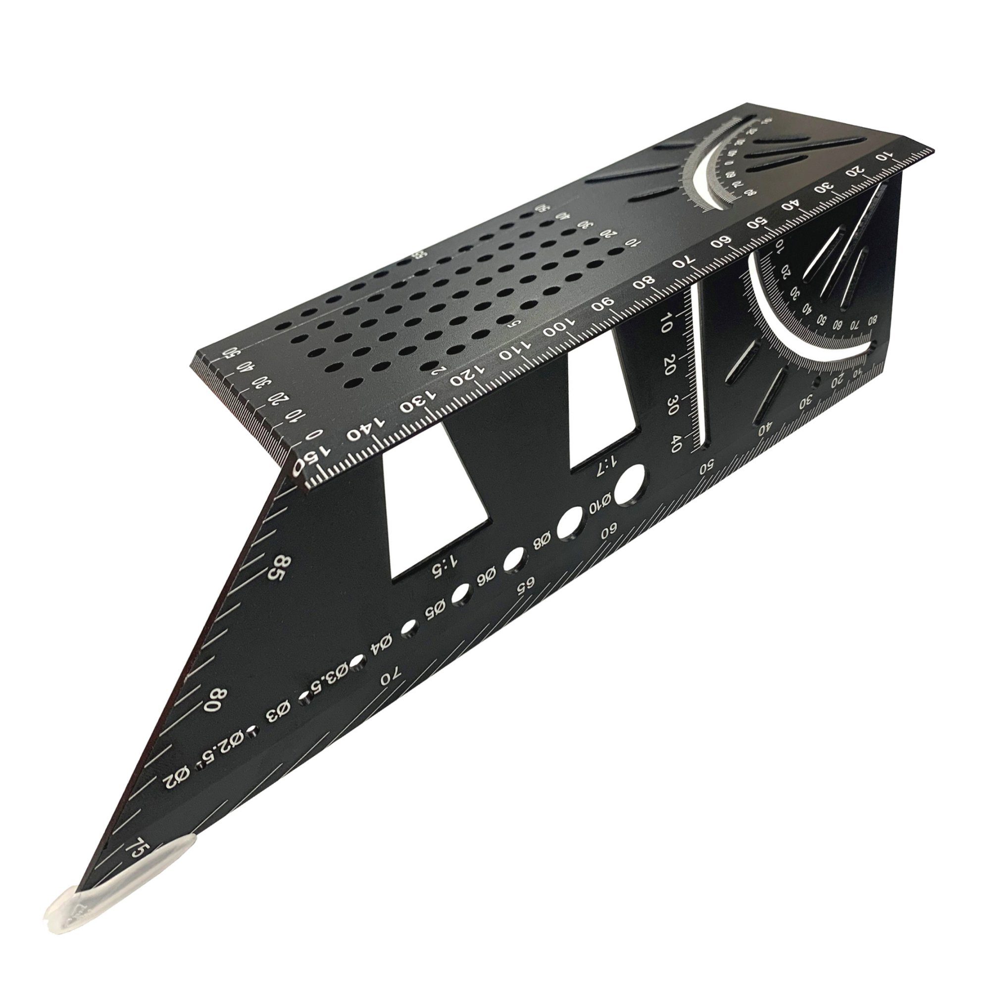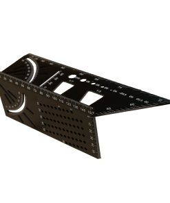 Aluminium alloy construction, suitable for measuring and transferring dimensions. 45° & 90° angle stop, marking gauge for parallel lines, drill size and guide. There are so many uses built into this unit you will find it indispensable in your workshop or toolbag. Great for marking and gauging cuts and angle. Super lightweight aluminium but in a matt black with white painted engraved marks for easy reading. Tough and strong with very little flex it measures both vertical and horizontal edges at the same time.