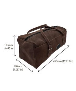 Manufactured from durable high quality split leather, double-stitched and riveted for added strength. With zip fastening. Carry handles are riveted and double stitched with supporting leather fully under the bag so the weight is carried through the handles- this makes it more comfortable and less stress on the handle joint. Dimensions 450 x 200 x 175mm