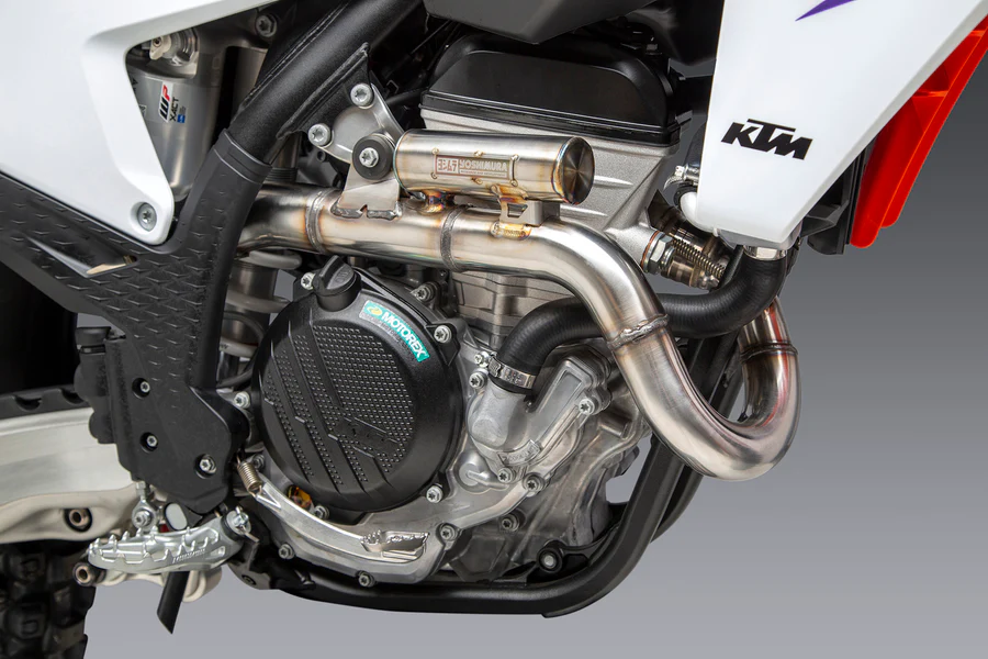 This system is the first Yoshimura production motocross exhaust to incorporate a resonator on the header and in the muffler. This new header resonator unlocks bottom and midrange power to not only make the new Austrian bikes more powerful, but provides more rider connectivity.