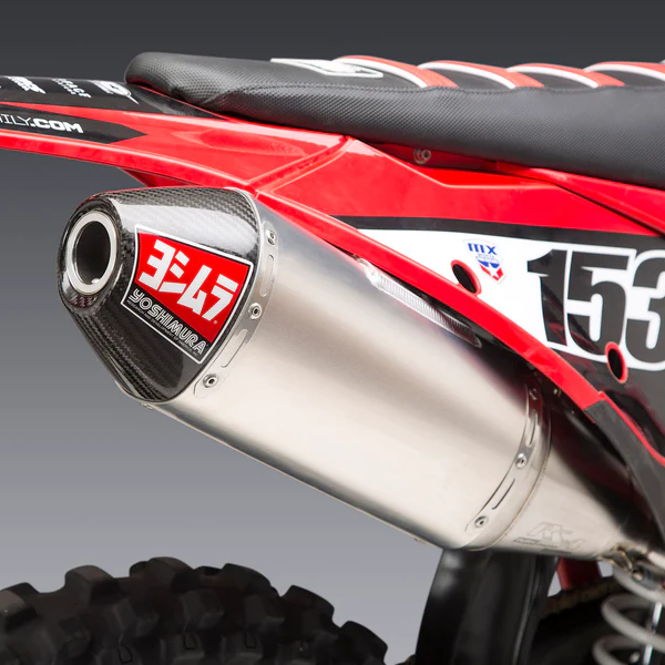 The RS-4 boasts its own resonance chamber and utilizes its volume and a unique baffling system to create the sound and power that is purely Yoshimura. Both the 250 and 350 make good horsepower and torque in stock form. Nevertheless work was done to improve power in every RPM range on these twin race machines and the gains attained with the RS-4 are quite impressive. With 450’s it’s not all about creating more power, it’s about creating more usable power and the RS-4 makes it happen. Max power is increased and max torque is increased throughout the power curve. Grip it and rip it!
