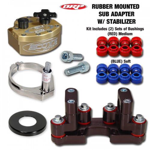 Designed to mount a Scotts stabilizer below the handlebar using your OEM cast or billet triple clamp. The BRP Rubber Mounted SUB adapter mounts to the existing rear bar mount holes and allows you to run in position 3 which is the most common and popular position. SUB Mounting a stabilizer offers several benefits over a conventional “above bar” setup and is becoming a very popular setup for GP’s, motocross, off road, dual sport applications and riders of taller stature.