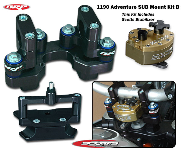 BRP Rubber Sub-Mount Kit is a complete kit that includes a Scotts steering stabilizer and tower for your KTM 1090/1190/1290 Adventure. This kit comes with a BRP Rubber Sub-Mount, bolt on tower and Scotts steering stabilizer with an 8mm longer link arm (required to use for this application).