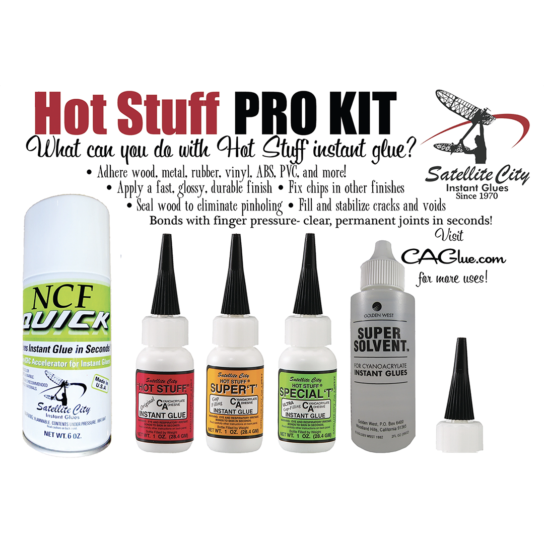 The Hot Stuff Pro Kit is perfect when you don’t need a lot of glue but you do need the ability to make different types of bonds. The kit comes with one 1oz bottle of Hot Stuff, Super T, and Special T as well as a 6oz NCF Quick aerosol accelerator, a 2oz bottle of debonder, and two extra spouts and overcaps. With this kit, you are prepared for nearly any bond.