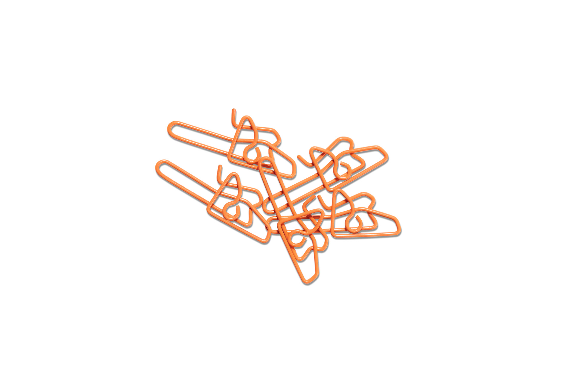 The clips are made of metal and, in addition to their unusual shape, also, stand out because of their orange colour.
