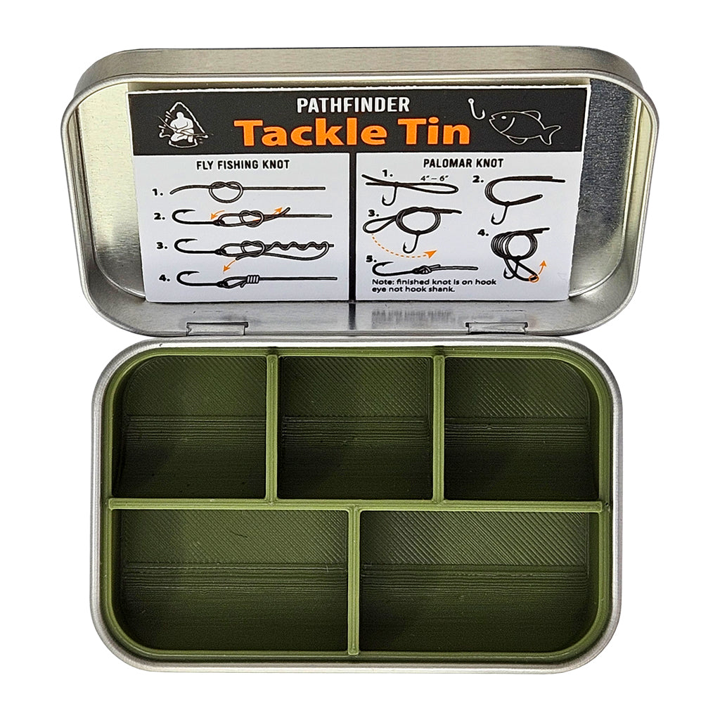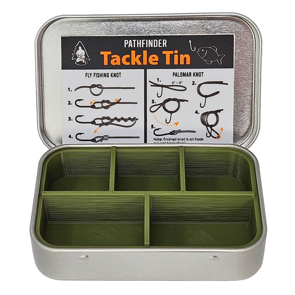 The Pathfinder Tackle Tin is the ultimate fishing companion. With 5 plastic compartments for organizing your tackle and a sticker guide to popular fishing knots, you’ll have everything you need to catch one. Made with a steel hinged tin, it’s compact and fits easily in any pack for on-the-go adventures. Go ahead and tackle your next outdoor trip with confidence and convenience!