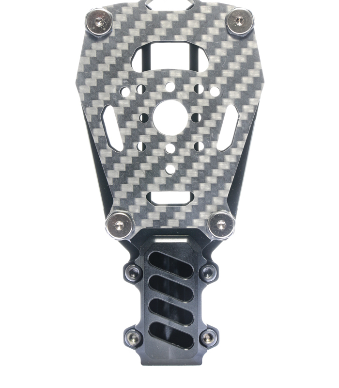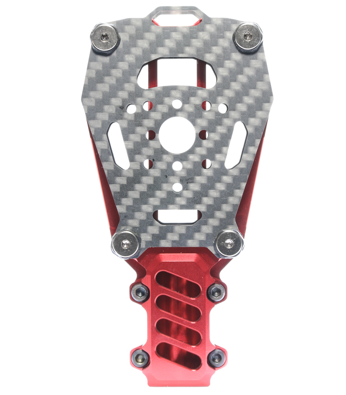 The mount is CNC machined out of lightweight 6061 aluminium and strong 3K carbon fibre. The carbon fibre plate has mounting holes configured triangularly, spaced 16mm, 19mm, 25mm and 27mm apart to suit most motors. The mount is available in two colour options, red and black. Opting for a combination of both can be used help you to distinguish the orientation of your multirotor in flight.