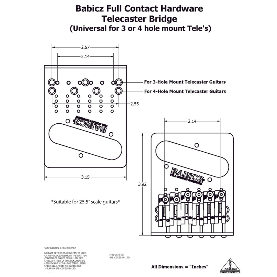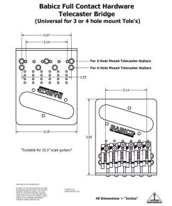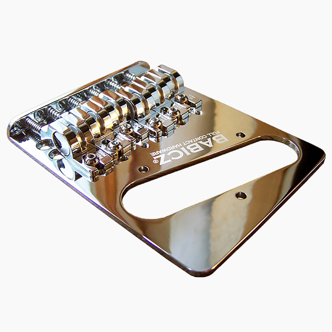 The “Full Contact Hardware” direct coupling system for “Telecaster” style bridges directly replaces the existing bridge, in either three or four hole mount systems. The “eCAM” saddle design means unwanted spaces between the bottom of the saddle and the top of the bridge plate are eliminated. The Babicz “Full Contact Hardware” replacement system for “Telecaster” style guitars offers unmatched stability, increased sustain, dramatically improved fullness and tone along with complete adjustability.