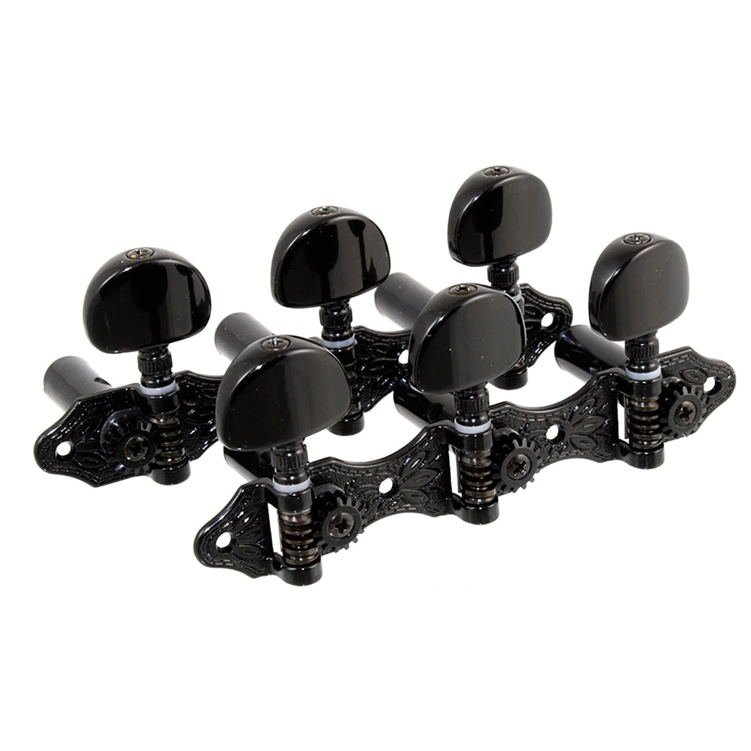 Classical Hauser style tuning keys, Black, with Black roller & buttons, 14:1, 1-3/8″ spacing. Allparts #TK-7957-003.