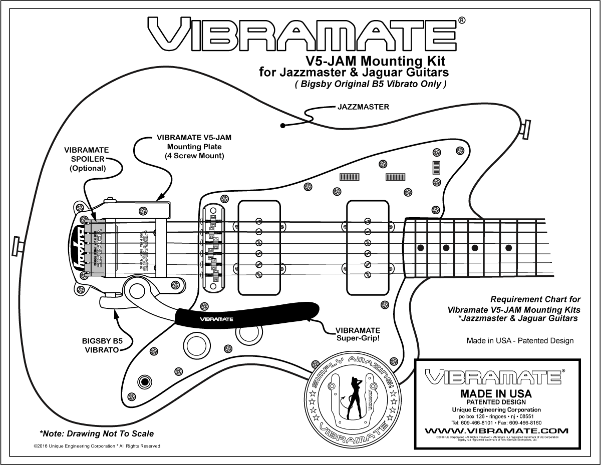 Now you can install a Bigsby B5 Vibrato on your Jazz Master or Jaguar guitar without drilling any holes! The Vibramate V5-JAM Model Mounting Kit is designed for a Bigsby B5 Original Vibrato and will fit most Standard Jazz Master or Jaguar guitars with Stock Vibrato Bridge. Part number TP-3748-005.