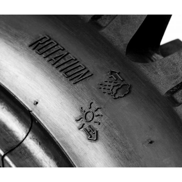 Riders can reverse rear direction when partially worn for extra grip and longer wear. The tread design gives rider choice for slightly better grip in their local conditions – whether mostly wet (mud), or mostly dry (loam and sand). The difference in handling can be as much as 10-15% depending on conditions. In varied or mixed conditions, best traction is achieved when new tyre is mounted in wet rotation, and changed to dry rotation half way through tyre life. Changing rotation isn’t essential, but appeals to budget conscious riders who seek maximum wear life.