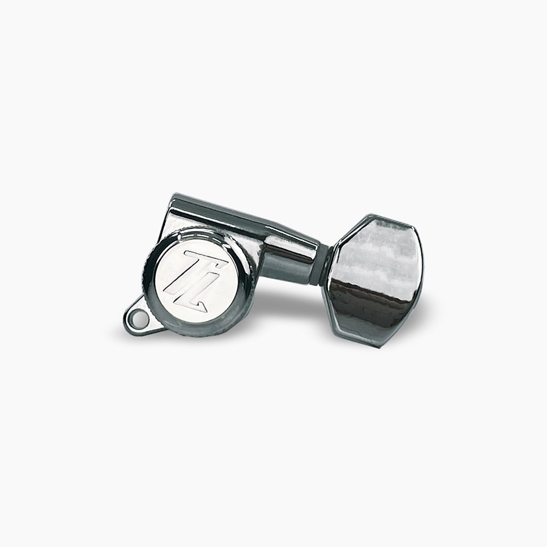 Designed for stability, accuracy and rigidity, our True Lok Mid-Sized 6-in-line locking tuning keys feature staggered posts that eliminate the need for a string guide, an 18:1 gear ratio for more accurate tuning, and an easy-to-use lock wheel on the back of the key that offer better tuning stability as well as making string changes quick and easy. Designed to be more compact than full-sized keys for use in smaller 3×3 headstocks, these keys offer a sleek, modern look that would complement any guitar!