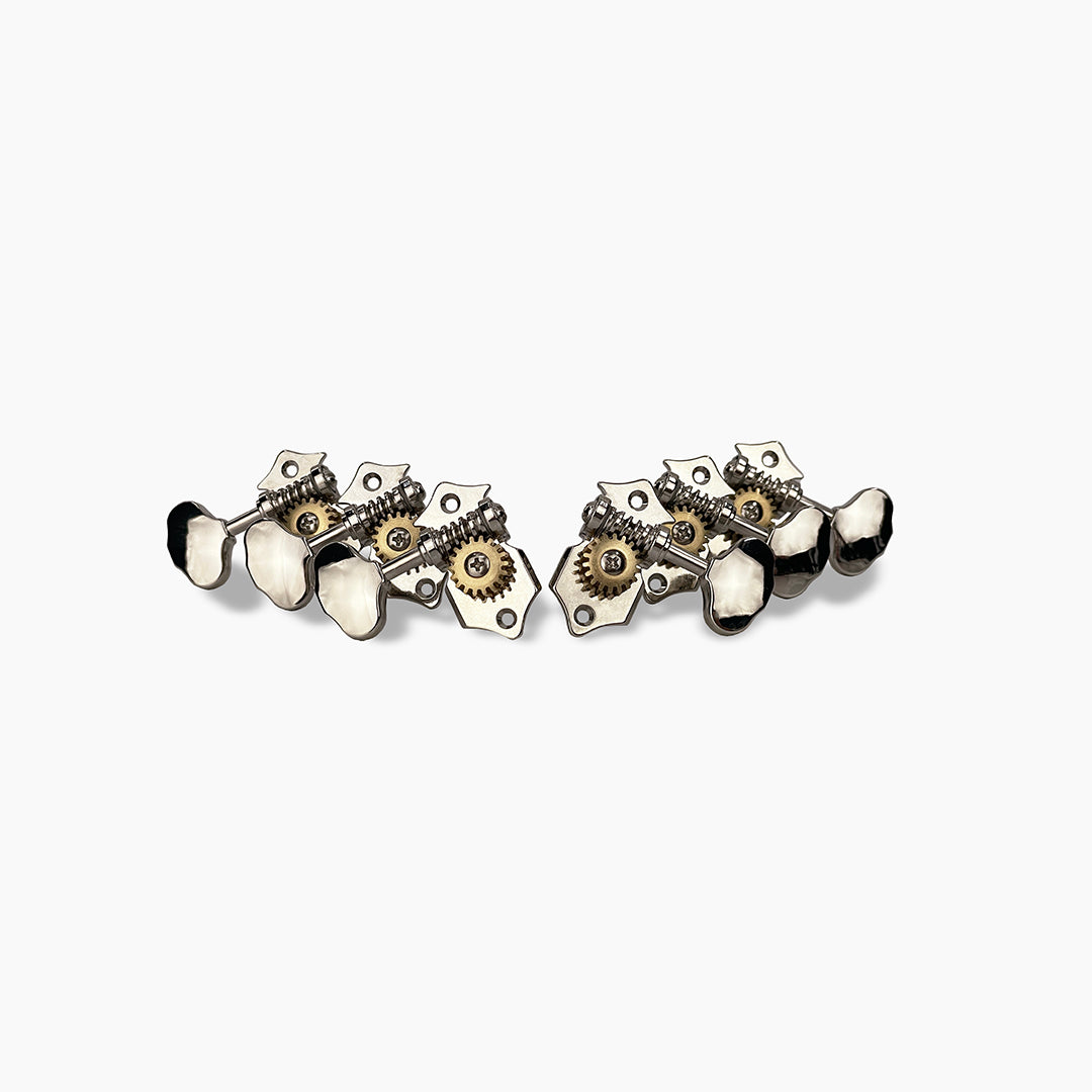 Our True-Tune Open Gear tuning keys offer a sleek and traditional look made to compliment any high-end guitar! The higher 18:1 gear ratio and tighter string post offer more accurate and stable tuning, and the high-quality steel worm gear with its nylon washers ensure a smoother high-end feel. This key features a collar on the base plate of the key surrounding the string post. This ensures the post sits properly in the headstock, centering it with the included bushings to help eliminate friction between the bushing and string post and allowing for smoother tuning and improves the over-all longevity of the key. Whereas some other open gear keys require a two-step hole (smaller hole for the post and larger hole for the bushing) to be drilled, the True-Tune open gear keys require only one size (8.5mm) hole to be drilled the in headstock for both the post collar and bushing. Whether upgrading your existing keys or installing them onto a new build, the True Tune Open Gear tuners were made to give your guitar a high-end look with stable and accurate tuning!