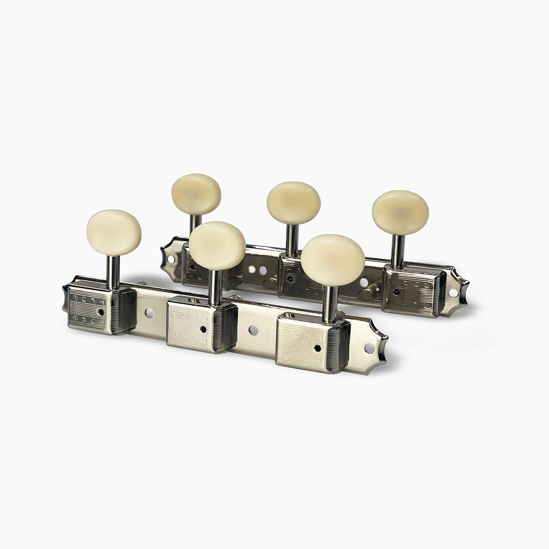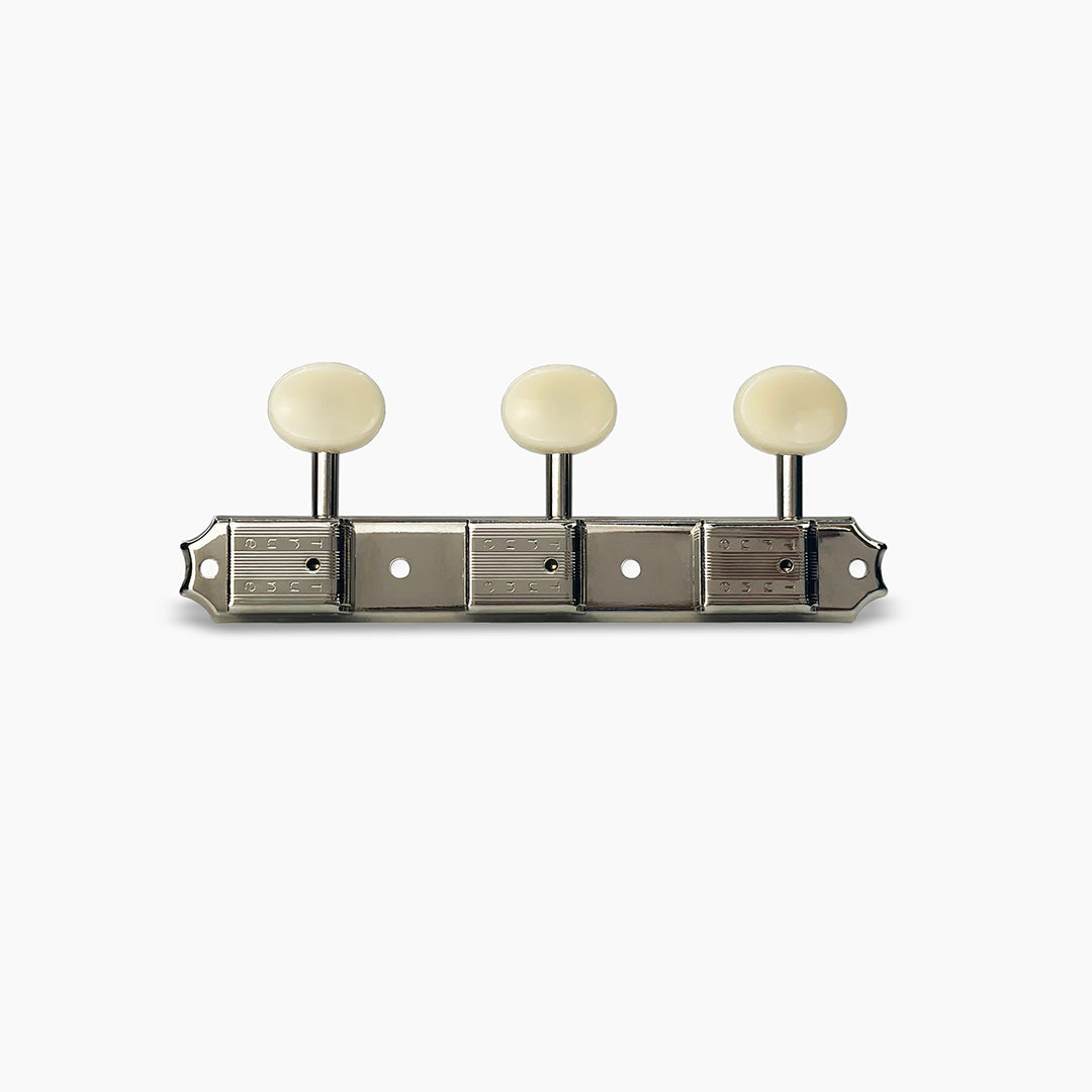 Our True Tune 3×3 Vintage Style Strip Keys were designed to be replacement upgrades for most vintage Gibson® acoustic and Jr series electric guitars using “3 on a strip” style tuners. The True Tune Vintage 3×3 Strip tuners feature a tension washer between the string post and base plate for a tighter feel and improved tonal transfer between the string and headstock, helping with sustain. The string post, base plate, and worm gear are made from high-quality steel for durability and a brighter tone and nylon washers have been added to the worm gear for a smoother feel. The Vintage 3×3 Strip tuners come with white oval buttons for a truly vintage look. Offered in nickel and gold the True Tune Vintage 3×3 Strip series keys are ready to upgrade your favorite guitar and keep you in tune longer!