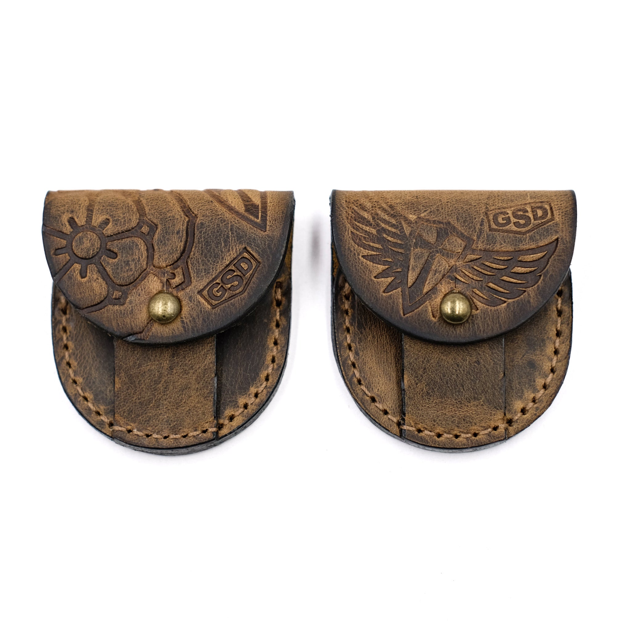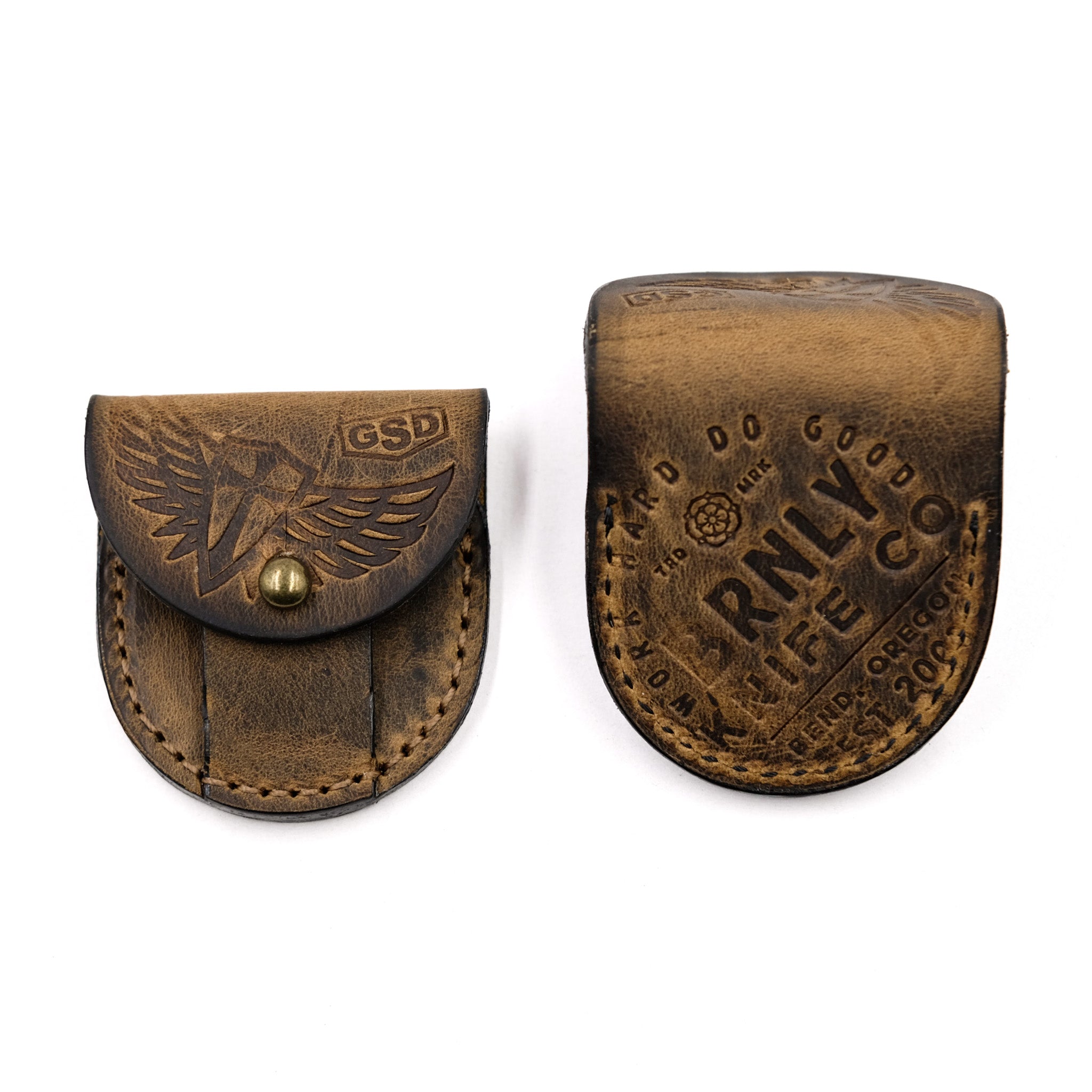 This distressed brown version is available in two versions: one stamped on the front with our Burnley Rose and the other with the Steel Flame Crusader. The inside of the pouch is stamped with the Steel Flame Bushido and the backside is stamped with our BRNLY Brand Knife Co. logo.