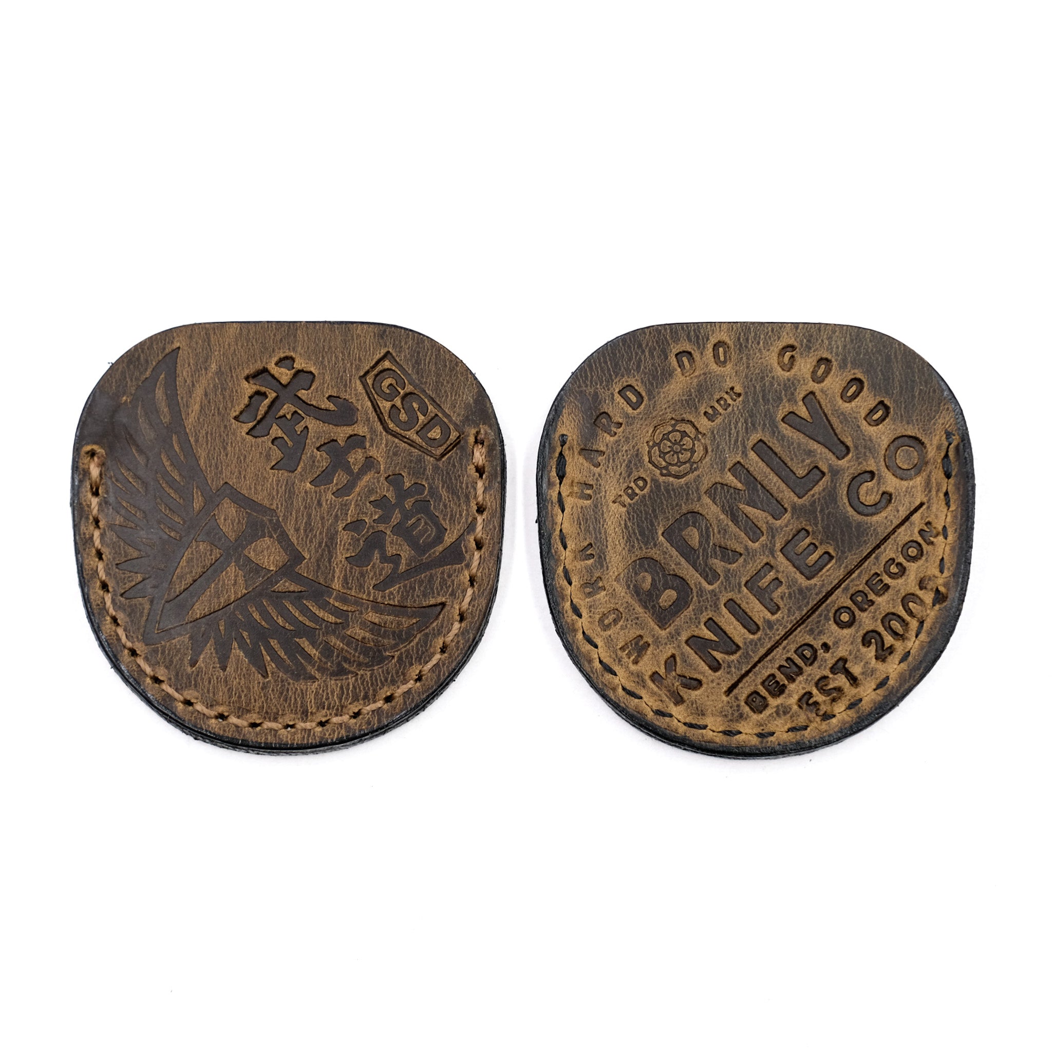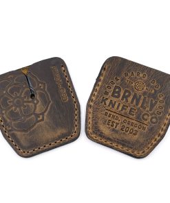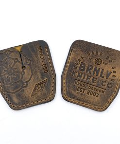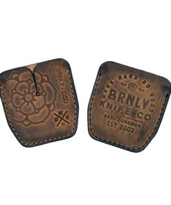 This distressed brown slip is available in 2 versions: one stamped on the front with our Burnley Rose and Steel Flame Bushido and the other with the Steel Flame Crusader and Bushido. The backside is stamped with our BRNLY Brand Knife Co. logo.