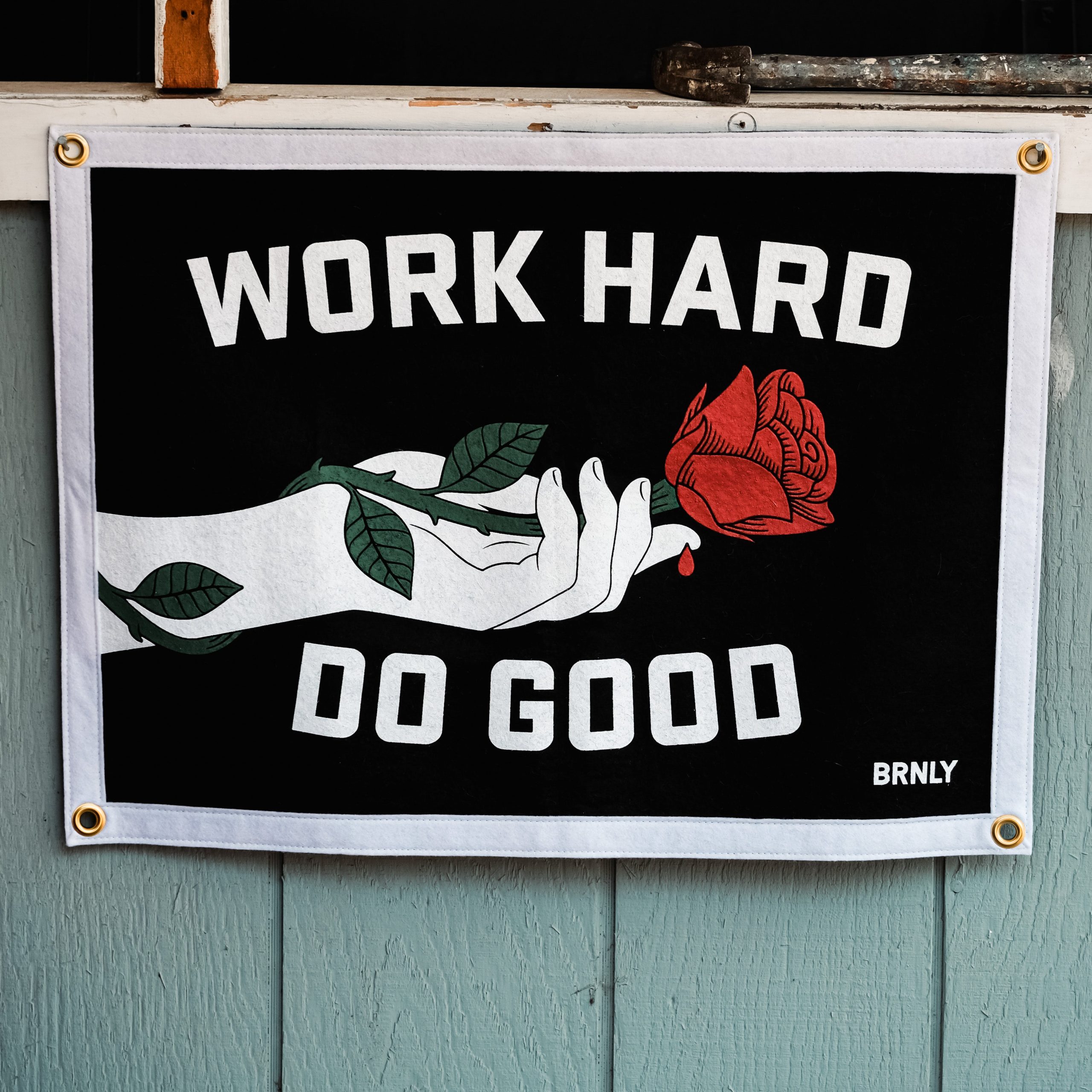 Hang one of our new Oxford Pennant Camp Flags wherever you want the reminder: Work Hard. Do Good.