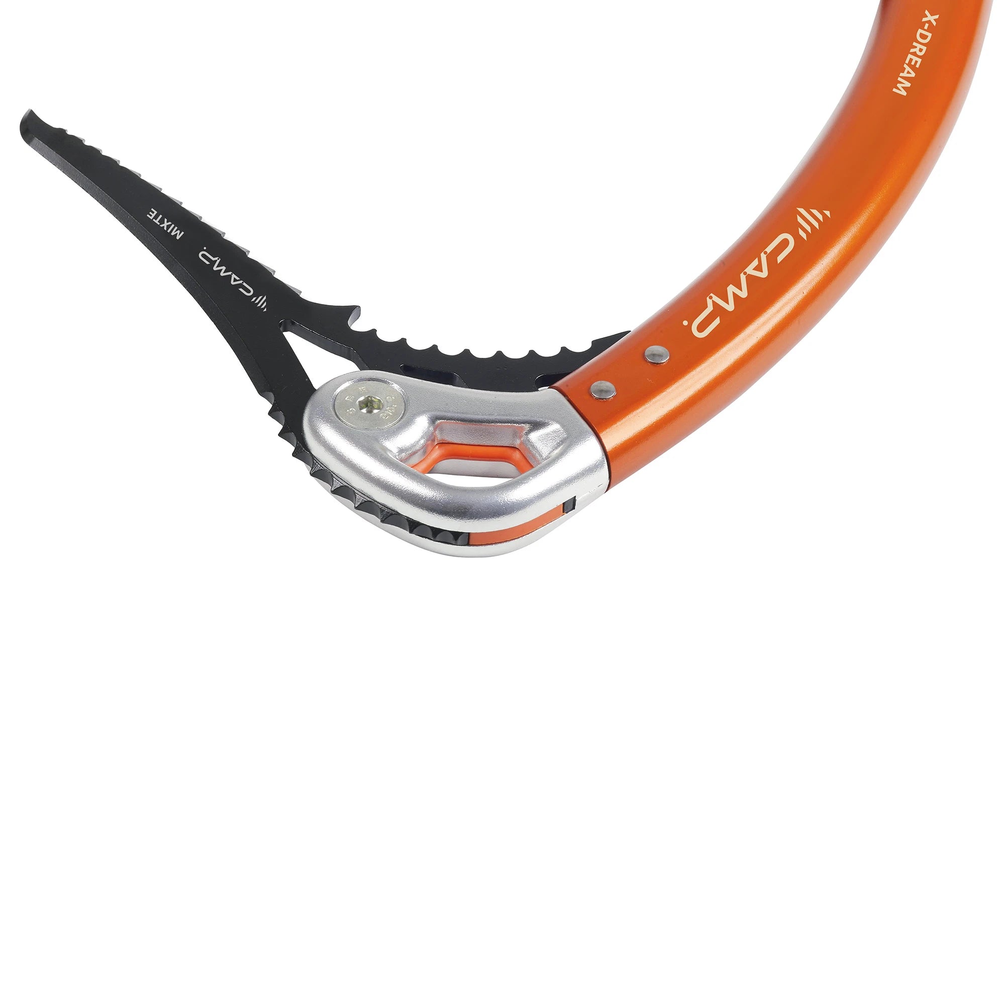 The X-Dream combines two tools in one – a fully optimized tool for technical ice and an aggressive dry tooling machine. This amazing ice axe not only features four different T rated picks for various terrain, but it also incorporates an innovative adjustment system in the handle to fine tune the swing and pull even further. Use the allen bolt above the grip to switch between Dry and Ice positions In the Dry position, the handle kicks upward for a more down and out pull. The Ice position drops the handle for a more natural swing on ice. Climbers can further refine the X-Dream with micro-adjustable trigger finger ledges (choose from two inserts – the X-Finger Small or the X-Finger Large – that can be flipped over to adjust the position) and the X-Rest insert which adjusts the overall height of the handle. All four picks feature a refined beak and tooth configuration. They are designed to provide solid sticks with minimal effort making them the perfect choice for brittle ice and technical mixed terrain. The X-Dream comes standard with the Mixte pick. The Ice pick brings the tip 6 mm closer to the handle, but maintains the same angle as the Mixte pick. The Mixte and Ice picks can be used alone or with the hammer or adze. The Race pick features a sharp beak for grappling with rock. The Total Dry pick is designed for maximum performance on overhanging dry tooling routes and in competitions.