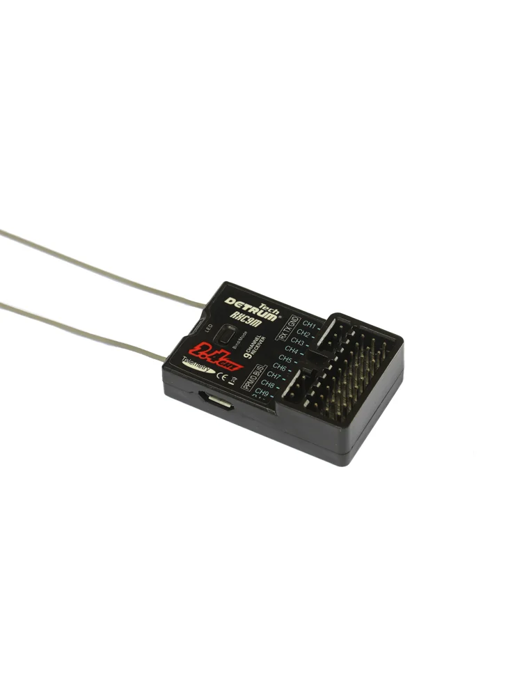 The RXC9M 2.4Ghz receiver is designed to work with the Detrum Blitz DT9 radio system. It’s packed full of features including 9 PWM outputs, a PPM / D.Bus Output (compatible with S.Bus) and most interestingly it has a DATA In interface. This can be connected to compatible flight controllers or telemetry sensors to provide real-time flight information on your radio control.