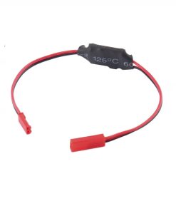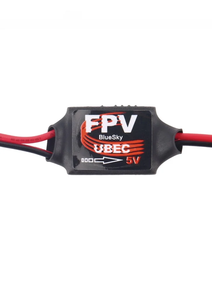 Here we have a small voltage regulator, which comes pre-soldered with JST power connections. There are two options available: One outputs 5 volts and the other steps down to provide 12 volts. Both can supply a constant 3amps. 5V is typically used to power RC receivers or flight controllers. 12V can be use by FPV cameras and lighting.
