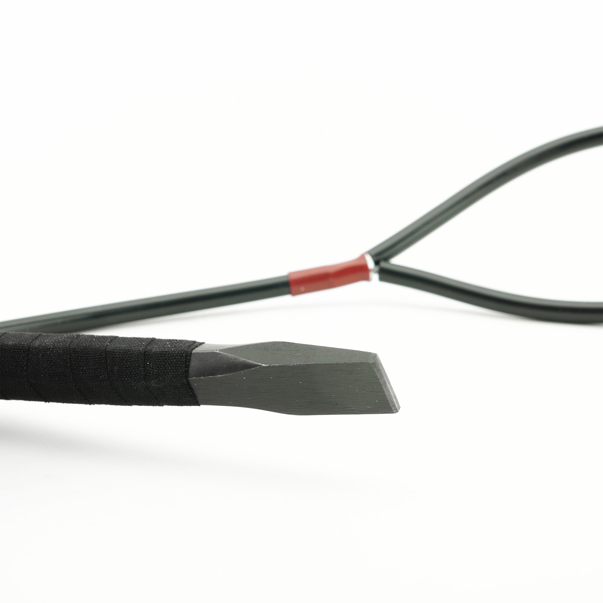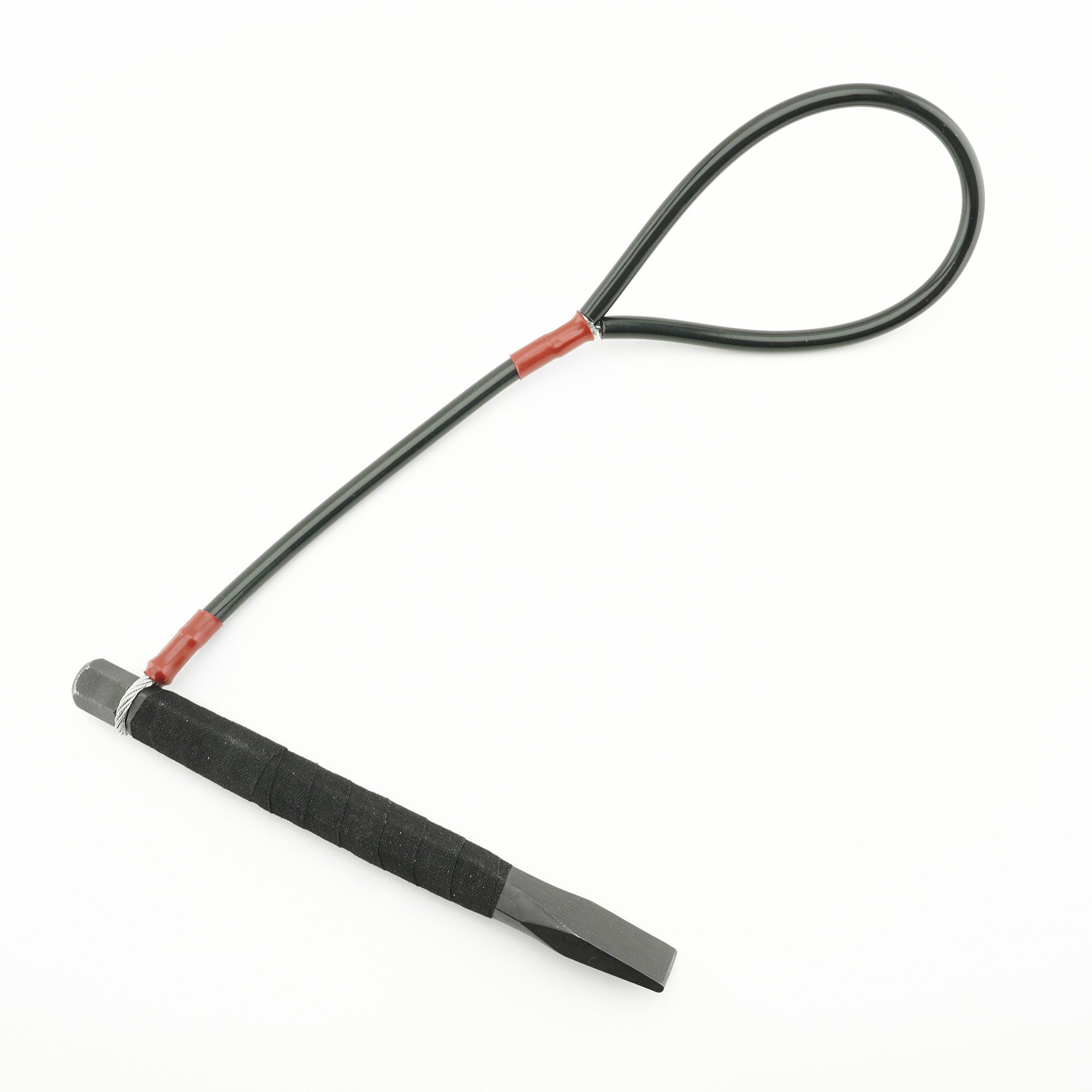 A 3/32” (#2-size) galvanized aircraft cable wrist loop is attached to the 5/8″ Blunt Chisel and is looped around a smooth, lathe-cut groove. The cable is covered with 1/4” black PVC tubing and the zinc-plated copper sleeves are covered with red PVC heat-shrink, for a smooth and comfortable feel. The 5/8″ Blunt Chisel is wrapped with black athletic cloth tape, for comfort and improved grip.