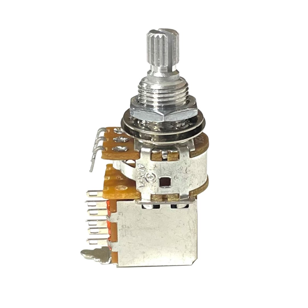 25K ohm push/pull audio taper potentiometer with nut and washer.