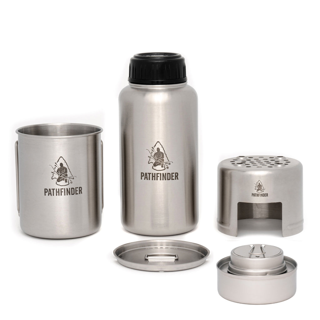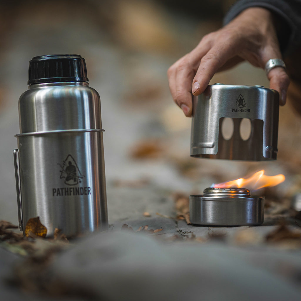 This compact and lightweight cook system is designed for outdoor cooking, emergency preparedness, and minimalist camping. The stainless steel bottle and cup provide safe and fire-ready hydration, while the alcohol stove and stove stand offer a simple, fuel-efficient cooking solution.