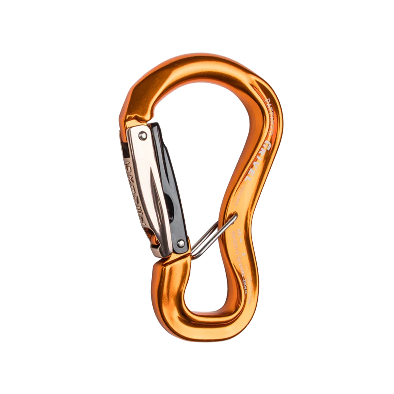 - Flat in the lower part to follow the shape of the webbings of the belay loops, with “captive” safety wire to avoid “cross loading” or positioning along the minor axis of the carabiner, which would greatly reduce its strength