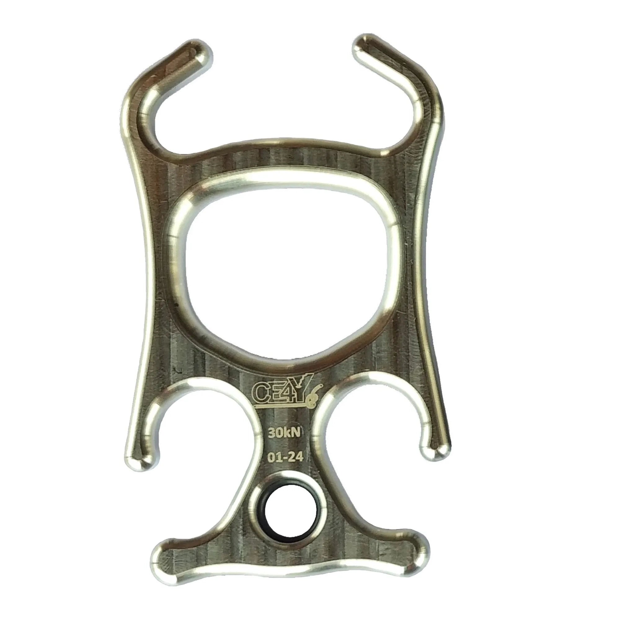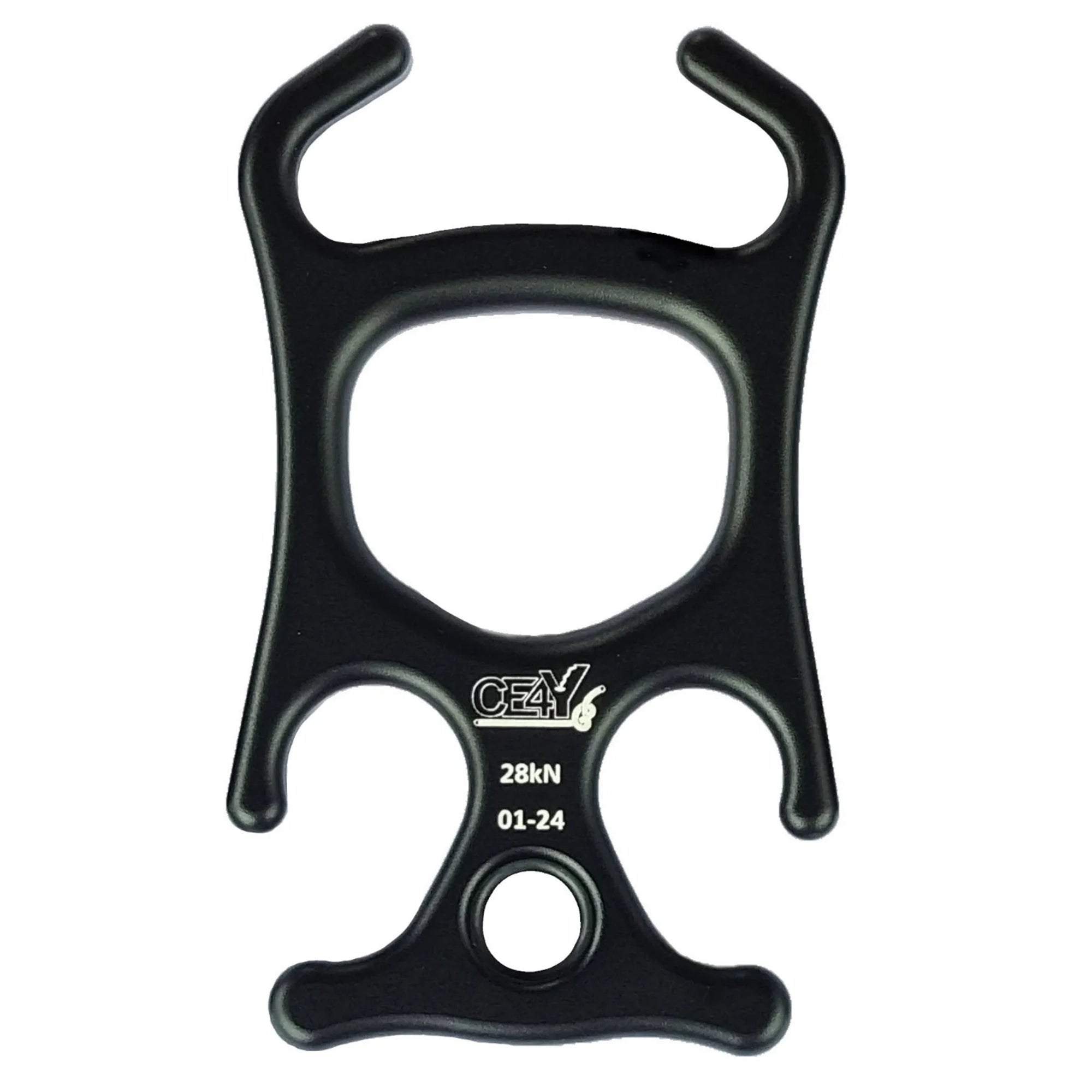 An innovative rappel/abseil device with lots of options which allow adjustment of friction while on rappel. The symmetrical design allows flipping that extends the life of the device.