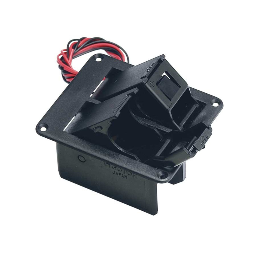 18-Volt deluxe battery compartment, holds 2 9-volt, Black, hole required 2-7/32″ x 1-15/16″.
