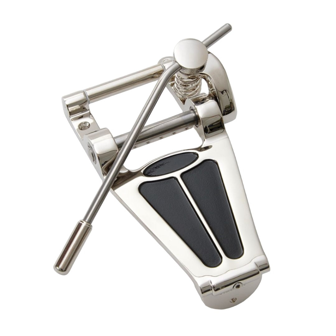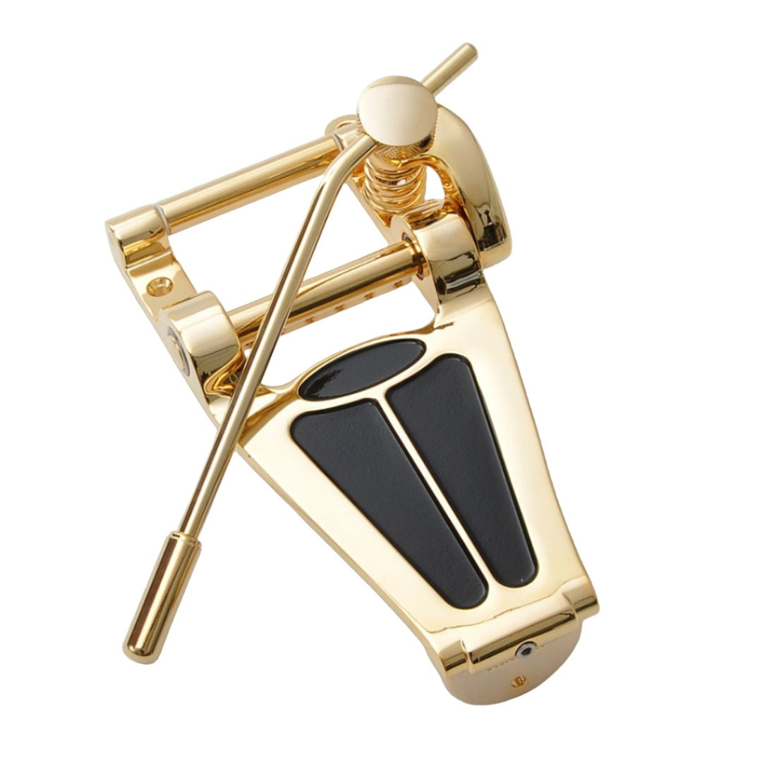 Inspired by the Duesenberg Diamond Deluxe Tremola, The Göldo G7 tremolo (MFG# TGD7) offers an aluminum frame for excellent tonal transfer and high-quality bearings that allow for smooth tremolo action and ensure tuning stability. The 360° rotatable round arm can be adjusted in length, response, position and movement and sting changes are made easy due string holes drilled into the bottom portion of the axel. Simply the best! The G7 is meant to be used on guitars with carved tops such as Les Paul® and ES-335® style guitars.