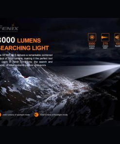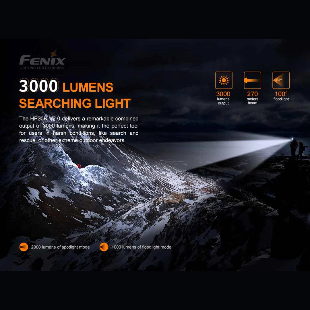 Fenix HP30R V2.0 is a professional headlamp with separate battery case, powered by two 21700 Li-ion batteries. This headlamp is rechargeable via the USBC port in the battery case, and the battery can be used as a power bank to charge other devices. The dial switch allows you to switch between four white spotlight output levels, and three neutral white floodlight output levels. The spot- and floodlight can be switched on simultaneously to deliver a max output of 3000 lumens. Made for the professional, the Fenix HP30R V2.0 Headlamp is built for performance—high performance.