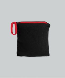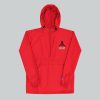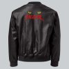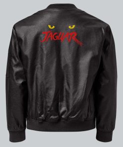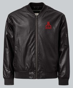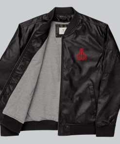 Black bomber jacket with a red Atari logo embroidered on the chest. Made from PU leather with a soft, gray lining and ribbed-knit collar, cuffs, and hem. Side pockets for your hands, and a small, zipped utility pocket on the sleeve.