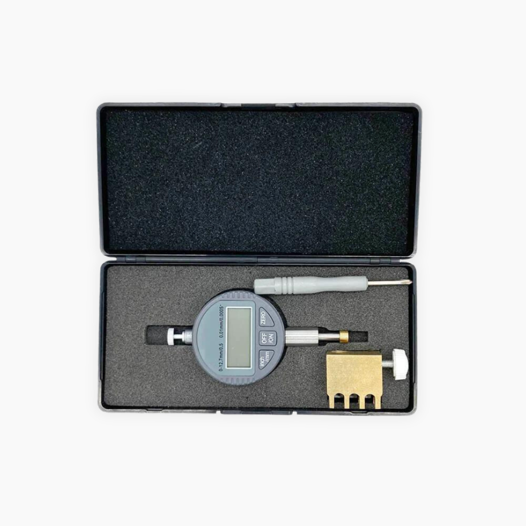 The Digital Nut Slotting Gauge measures the height of the first fret so that you can file your nut depths more accurately. This gauge features a brass base that fits over the fret and strings, and is accurate to .0005″(0.01mm).